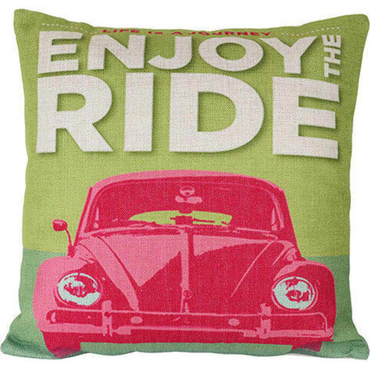 Grace your home with more comfort in the seating area as the more cushions you add, the more comfy the feel and the appearance shall be . This cushion is square and has dimensions that make it moderately large top be layered along with slightly larger or smaller cushions or even with rectangular cushion. The green and pink combination is truly vibrant. The words printed across its face says what life should be all about-enjoying a ride- and that makes the cushion and its mood enhancing factor all the more pleasing. Convert your spaces into a more relaxed one with the gorgeous feel and texture as well as print design of these cotton and linen cushion. Stitched to give it strength and yet remain bright and vibrant despite much usage.