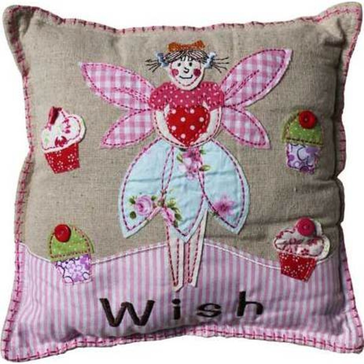 The Fairy Wish?Cushion is a magnificent piece of art decoration that could make a great gift for any girl. Its attention to detail is truly where this piece shines. The bright hot pink shades is where this cushion shines. The fairy along with the cupcakes along the sides create a "wonderland" imagination that is both fun and pretty. This meticulous attention to detail along with its perfectly thought out colour scheme truly encompasses the nature of this well made cushion. This is a wonderful piece that will be a popular sell to customers.