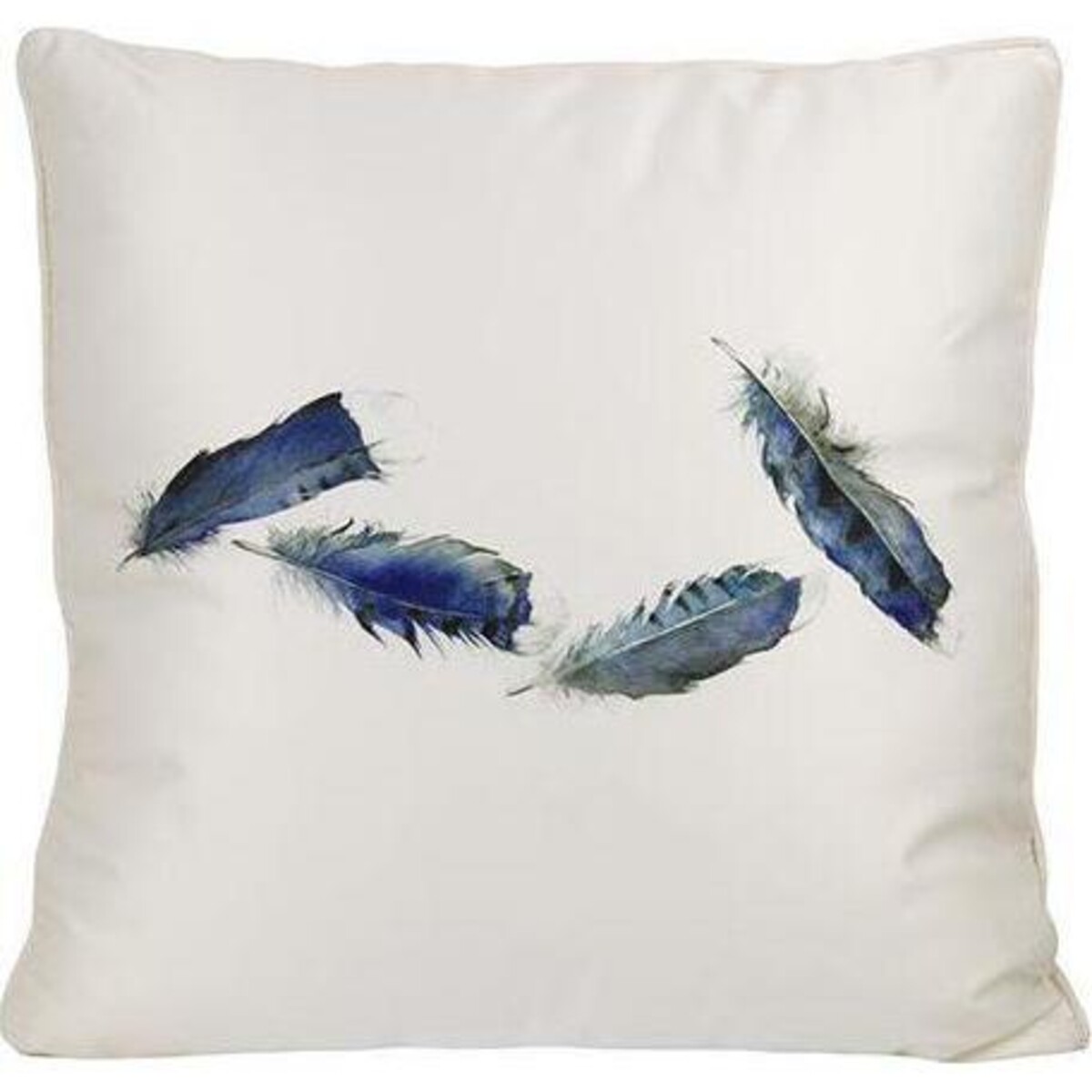 This ivory coloured polyester cushion is truly soft and comforting .The filling is the kind that will not flatten out despite long usage. The graphic printing of falling feathers gives it a feeling of lightweight comfort and thus makes it most suitable for couches where it could be teamed up with lighter or darker hued cushions is smaller size or square shapes so that it could create more drama though variation. The deep blue gray feathers seem to be falling from heaven as if suspended for a while as they are about to land on the seating where you have placed it-it is this airiness that gives any kind of feathery print its textural and symbolic beauty as well. This woven polyester will with stand long usage and the piping along the edges will ensure that the piece looks exquisitely finished.