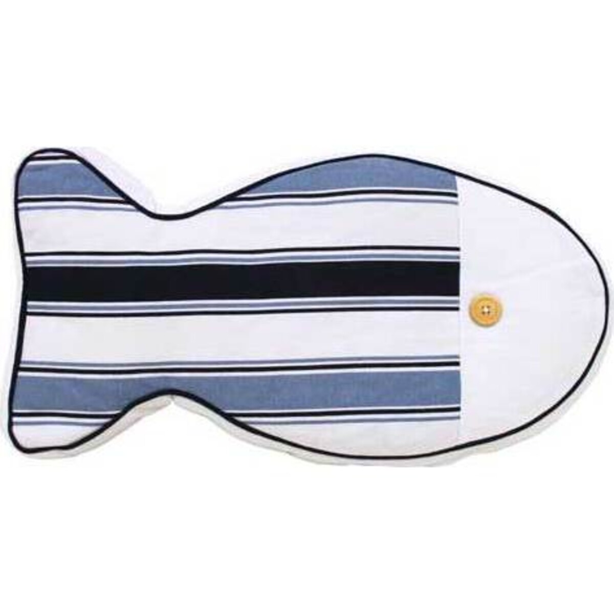 Cushion Fish Double Stripe is a white upholstery item made using Calico material. It measures 45x24x5 cm and comes to the user filled, comprising of blue longitudinal lines with the centre one being navy blue. These lines align together at their end, just before reaching the head. A yellowish button is positioned towards the head, at the point where the centre stripe makes a sudden stop. Homeowners can accentuate how their home looks by including several of these cushions as part of interior decor initiatives. Cushion Fish Double Stripe can be used on a balcony couch or indoors in the presence of full natural light to reflect its magnificence.