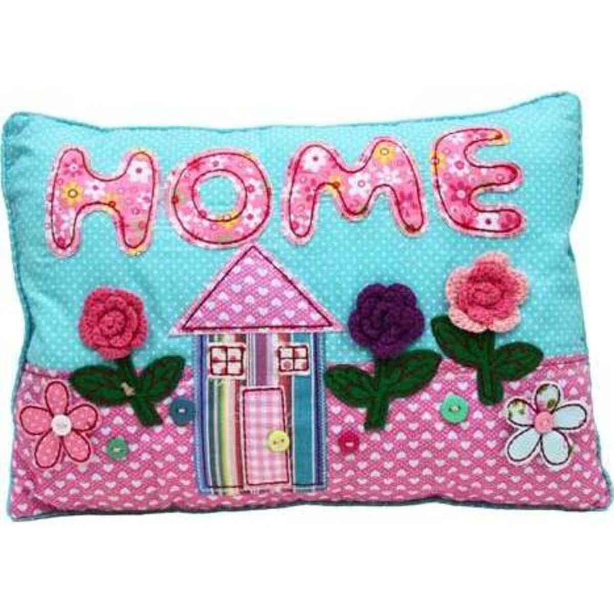 é The word HOME in a pink and white floral pattern is top stitched in red.