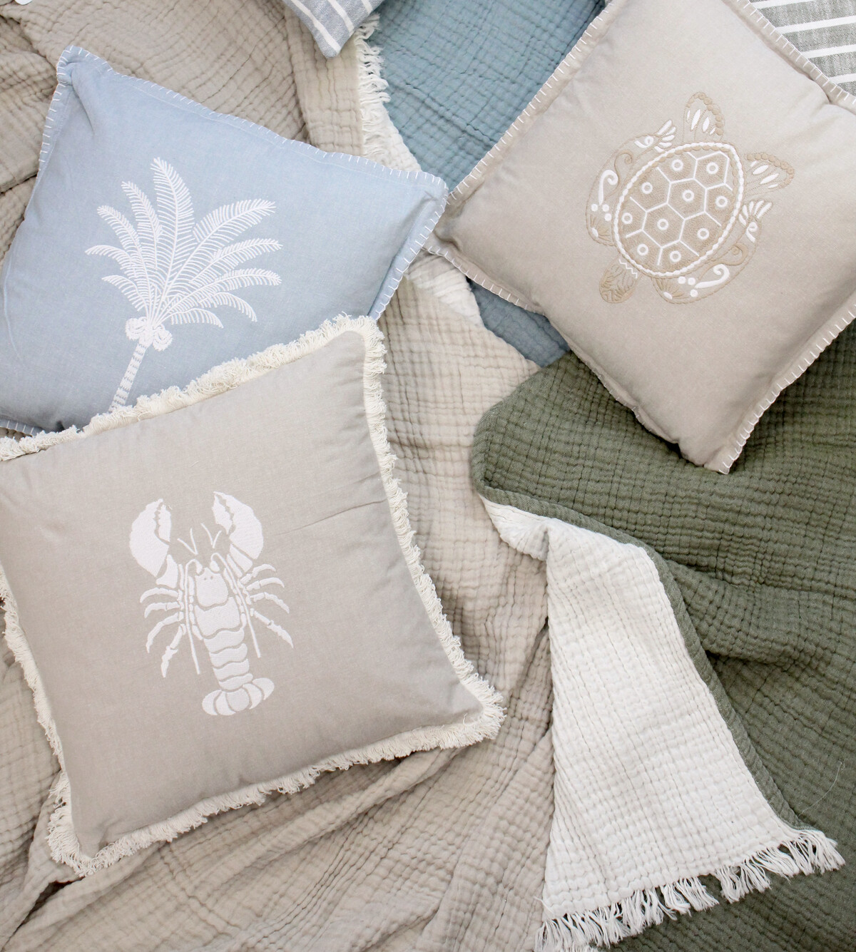That unique lobster motif is pure fun, and the fringing just takes it up a notch. Stonewashed chambray cotton ensures durability and comfort - this one will be in your customer's home for years to come