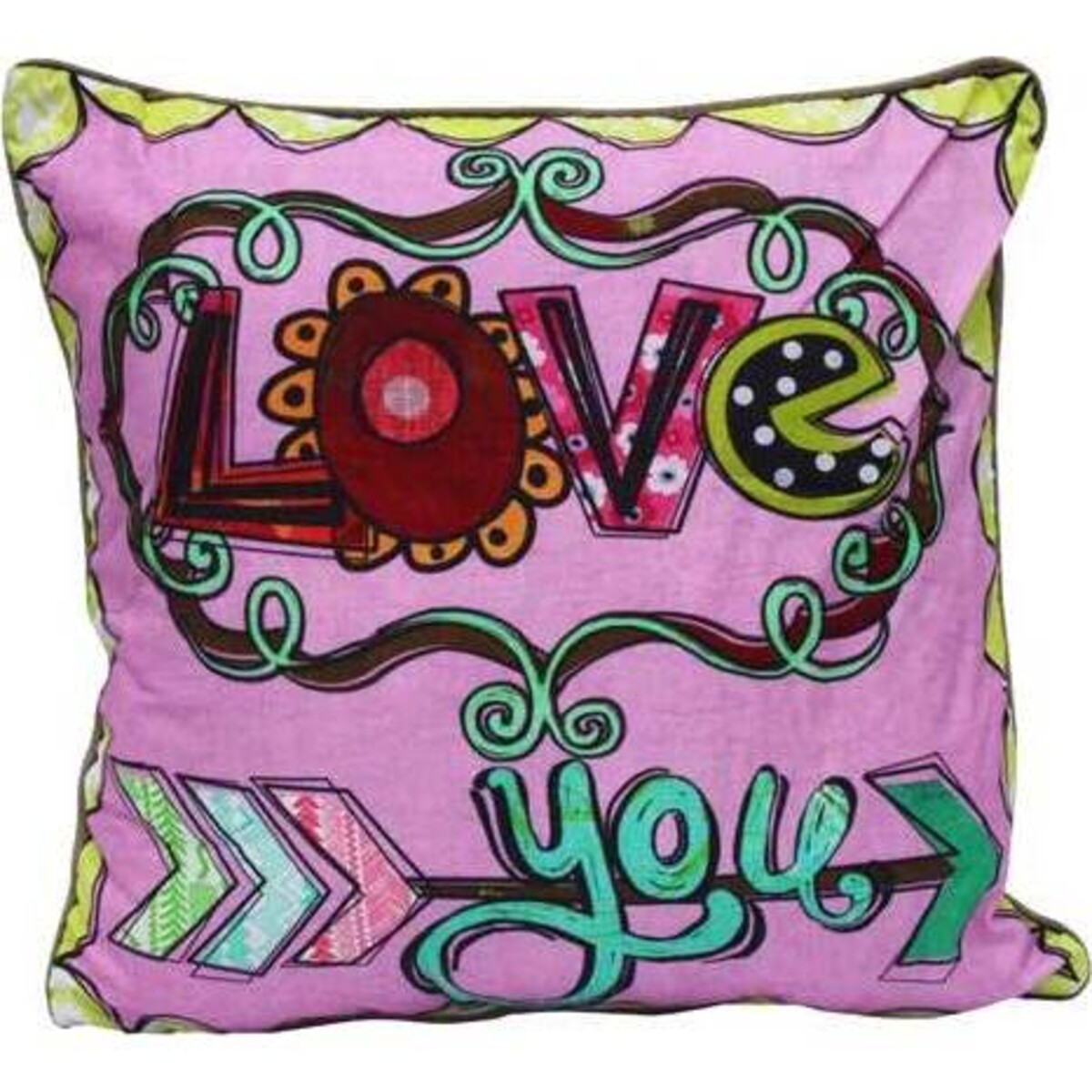 Little propped up cushion with designs on them or better still lovely positive messages on them can actually convey a great deal while still being things of mere convenience around the house. Decor ideas truly have come a long way and cushions are seen not merely as comfort providers but also a means to add colour and vibrancy to the interior. This cushion in a soft and fine fabric conveys the message of love in a subtle colourful and joyful way with the proverbial arrow running all through the letters of the word - 'You'. Conveys the message - Love You - is a subtle sort of way - very much in keeping with the decor idea of shabby chic. This cushion is easy to clean and dry; made with a good natural feel fabric, the kind one would love to touch and feel. The pale dusty pink and the print on it is bright. The stitching on the edging is neat. The usage on a couch will transform its look altogether and bring in the fun element. It will also help add splash of colour to the children's room as well.