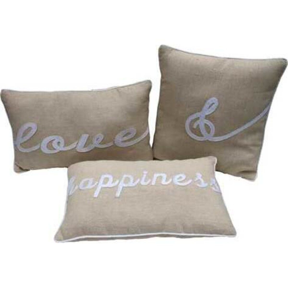 Our set of three Love & Happiness cushions are small enough to be grouped together, and they should be because each one delivers an important part of the message. • Two rectangular and one square pillow each bears a different word, "Love", "&", "Happiness" appliquéd onto the front. • Soft taupe colour on the body is washable polyester cotton with a natural linen-like appearance, and pillows are bordered with white cord trim. Pillows make a great addition to any room including children's rooms. Add these to your lifestyle displays, children's department, gift and home goods departments, and furniture settings.