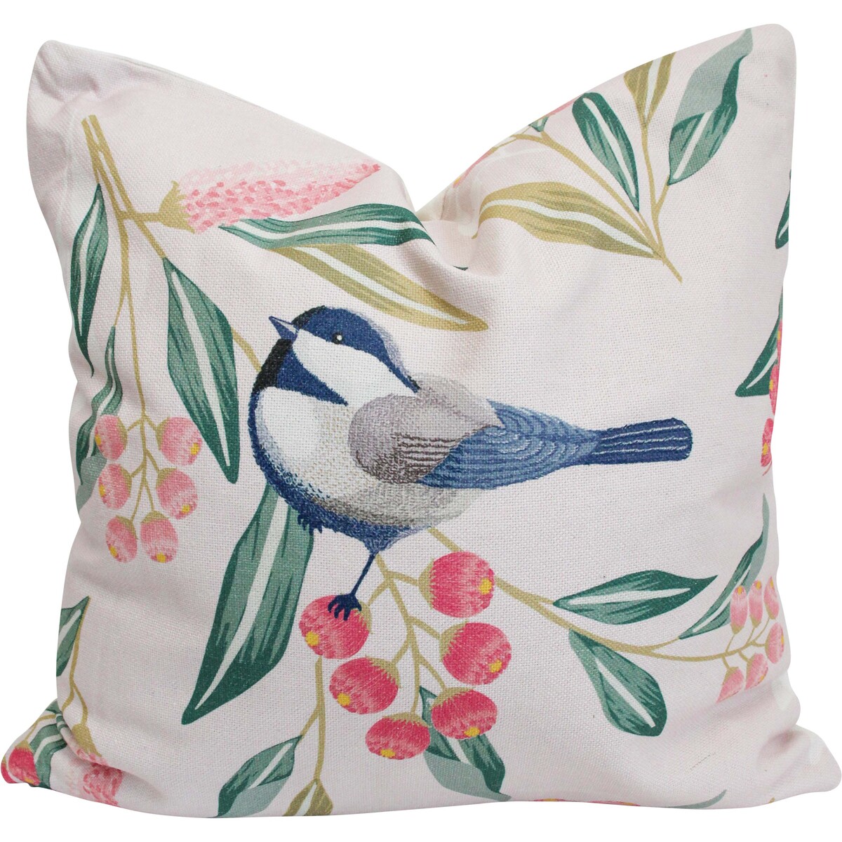 One of the themes that sell always is nature. There's virtually no Australian that doesn't love nature. This is not surprising given the fact that we are surrounded by beautiful landscape and exotic animals. It is based upon this that the Cushion Pretty Bird draws inspiration for its bird theme. The cushion depicts a beautiful bird plumed in colours of blue and white while perched on a tree branch. The tree itself has beautiful pink coloured blossoms and pastel green coloured leaves. It is made of cotton, linen and polyester.