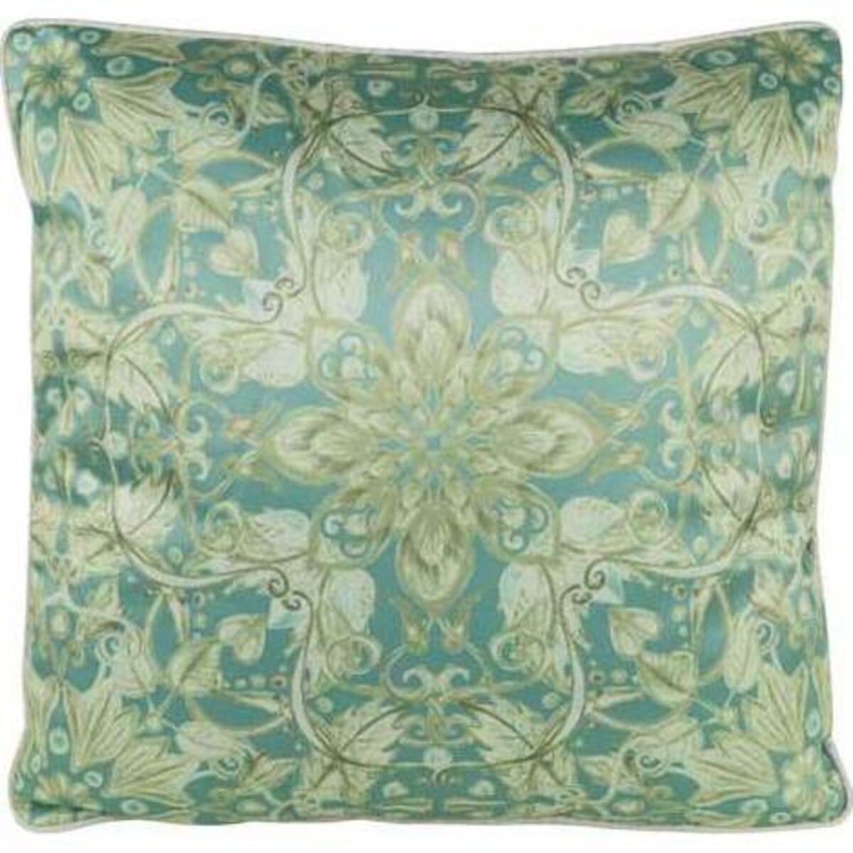 The very softness of the blue in this cushion in itself will bring in a feeling of calm and tranquil atmosphere. The cover features a large white floral motif interspersed with gray and ivory tones on a backdrop of pale powdery blue-so delicate and fine that one would truly have to think what the predominant colour really is. One can use this cushion along with pale or deeper blues and that would entirely change the way the couch would look. Or one could use them in larger numbers on the ottoman or the settee and create a whole new colour and design effect. The colours are so soft that in interiors based on pastel shades, it would blend in well. The print on polyester is vivid and has managed to catch all the details of the design. One can also use this cushion to add to the vintage classic look if that is the existing theme or if one wishes to create more drama this could be added to a moiré French baroque look by adding silver and gold highlights in the decor. The cushion is square and has 44 cm dimensions through it could be teamed up with smaller or larger pieces with equal ease.