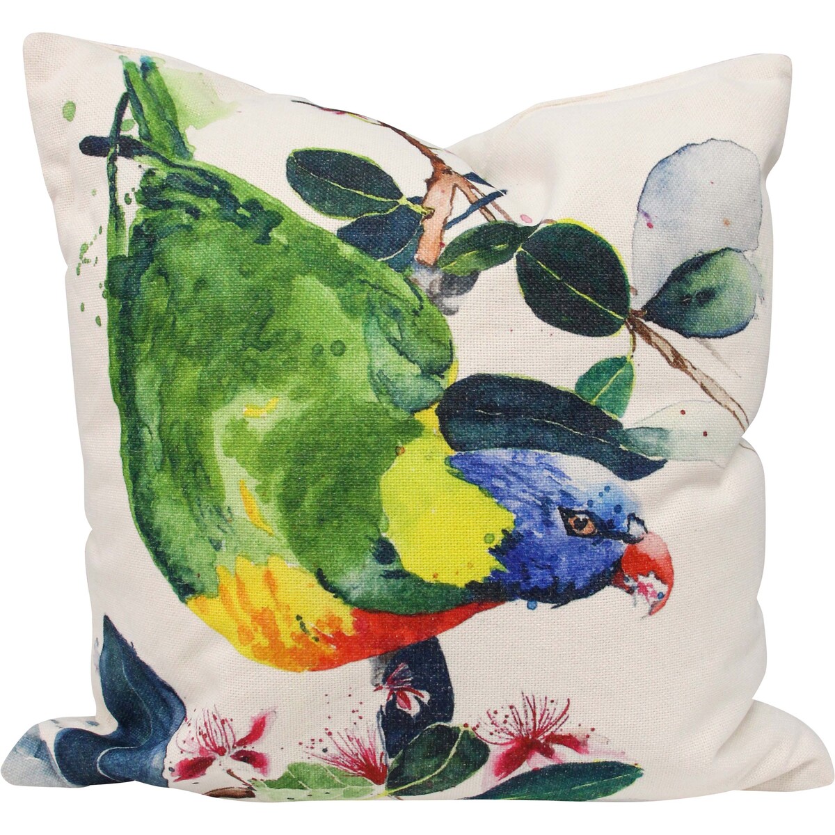 The often noisy and belligerent Lorikeet parrots are a common sight in several parts of our country - especially Western and Northern Australia. Did you know that these birds, especially the red-collared northern lorikeets were once considered as "drunken birds" whenever it is wet season? This is because during this period, they often fly awkwardly and even sometimes run into things. It is these multi-coloured lorikeets that inspired the adorable design showcased on this pretty cushion. Just like the actual bird it depicts, the image on this cushion is presented with multiple colours like a rainbow.