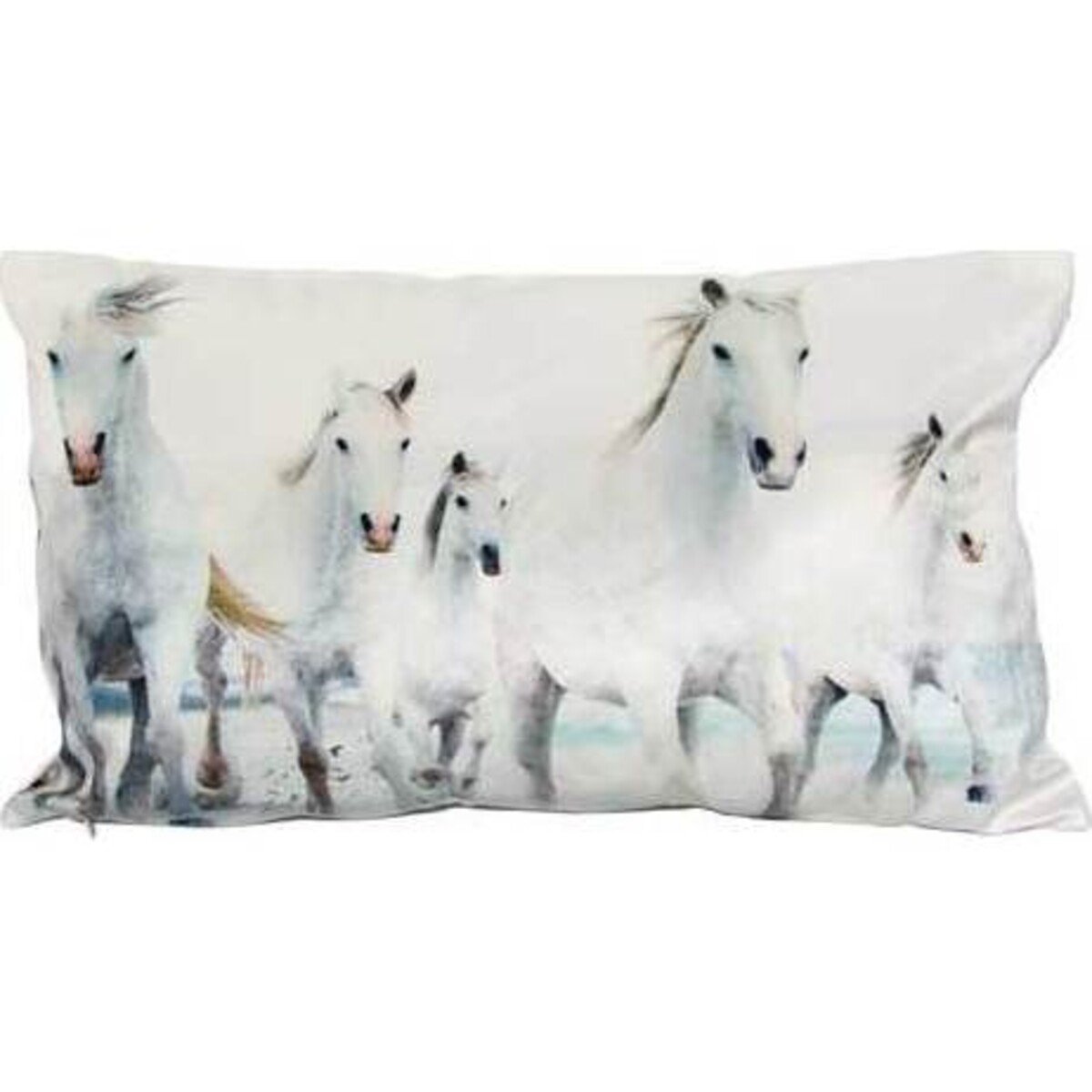 The cushion is long, made of velvet and a 50 cm in length and 30 cm in width - its horse print looking truly magnificent and full of an energising presence. The colour tone sis quite neutral - dull whites, greys and beiges that define the beautiful pictures of five runaway horses as they seem to be defying the wind and its speed. The velvet cushion is luxuriant in its feel, will look great set amidst neutral coloured throws and other cushions that could make up a pile on the main living room couch. Could also look truly centrepiece attractive when placed on large armchairs or divans that have other cushions set in the background. A great way to build in a nature theme as well as give the decor afresh new feel of wild and rugged nature.
