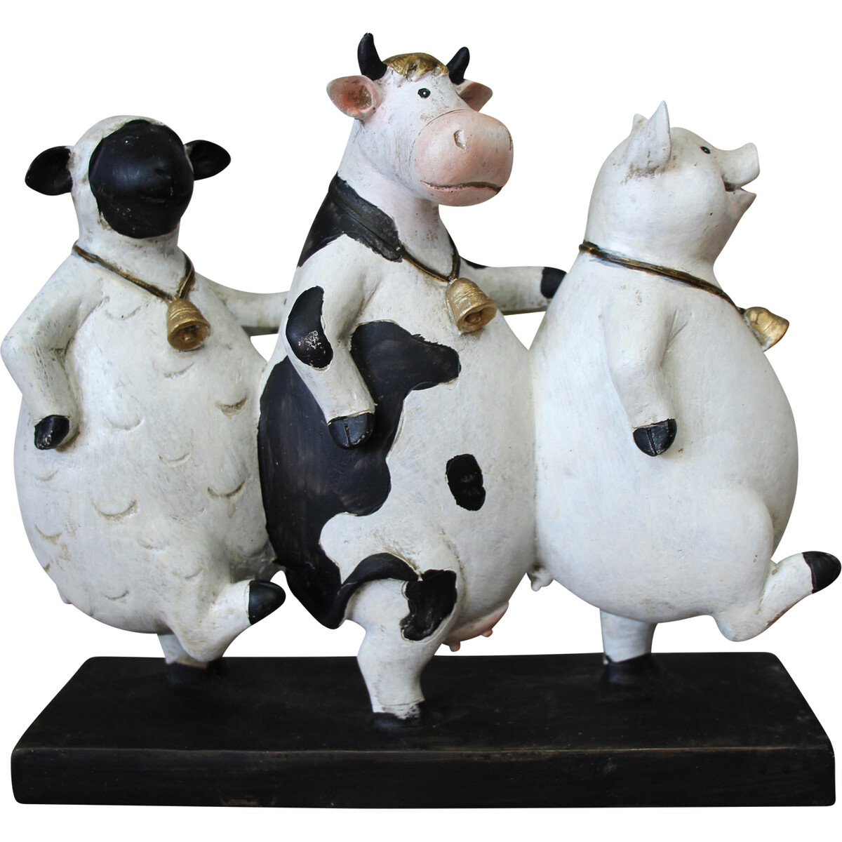 It is only through artfully designed figurine pieces like this LaVida's Cows Dancing Troupe that you get to see cows dancing. I mean, just imagine cows waddling, wobbling, shaking and swaying all that fat around in the name of dancing, it would definitely be a hilarious sight! Displaying these charming dancing sheep, cow and pig on office table tops, living room centre table, personal library reading table and bookshelves would instantly bring an amusing smile to the lips of guests. If they continue to stare at it, it might develop into a full, blown outburst of laughter. It features three differently coloured, sized and designed cows with all except the first joined via the belly to the back of the next. The last troupe member is a sheep with a black face, the one in the middle is the cow with black and white painting while the first is a white painted pig. The cow seems to be the leader of the troupe while all three have bells hanging around their necks. Your clientele would like this decorative hilarity.