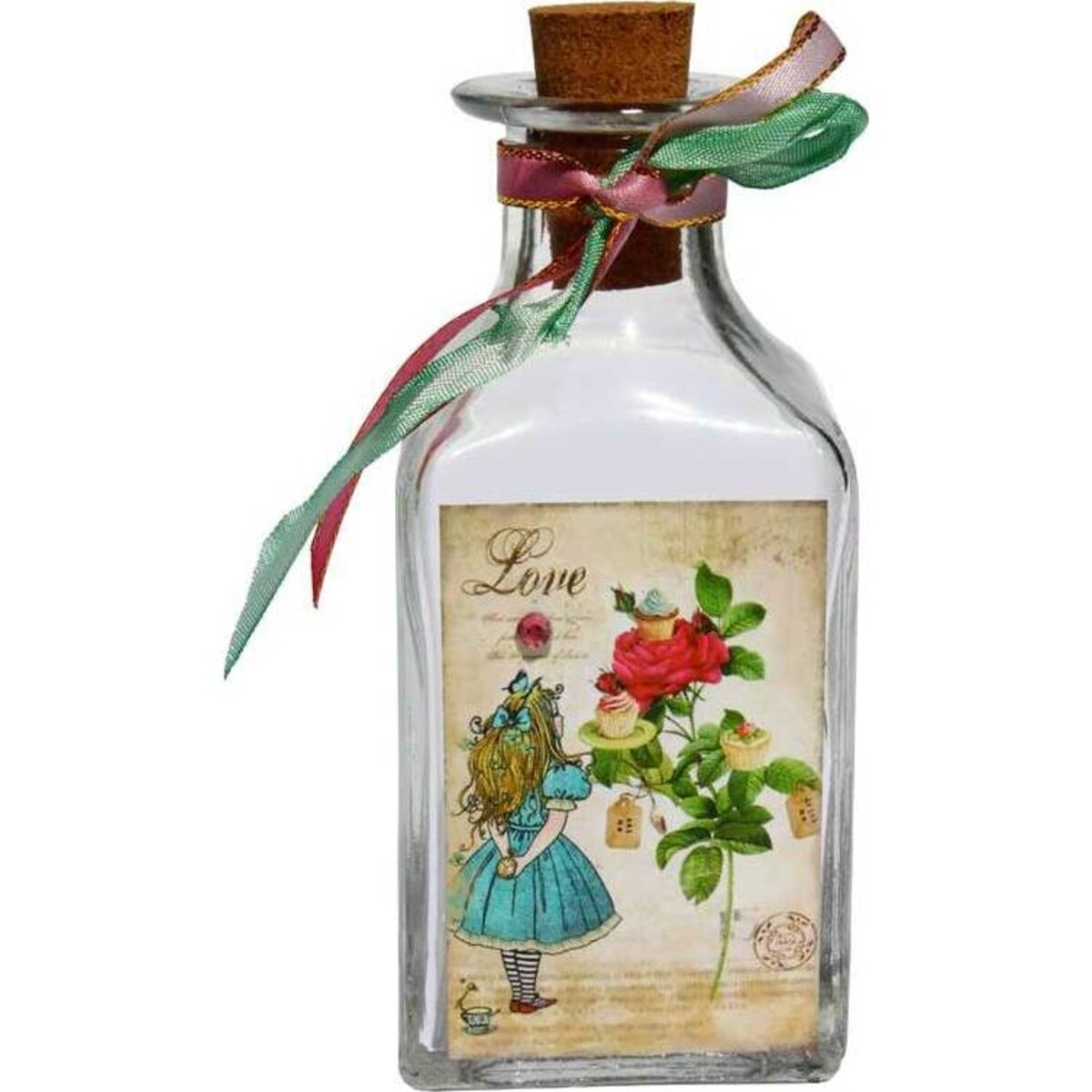 Introducing the Rose Alice décor Bottle, a gorgeous work of art in itself. The clear glass bottle has a cork closure and a label in the front that features an Alice in Wonderland type design with a little girl in a blue dress gazing upon a cupcake decorated rose. Fill the bottle with sand, fragrance beads, scented oil or just leave it empty and it's going to be a lovely addition to your home wherever you choose to place it. Isn't it great when a decorative accent can be so versatile?