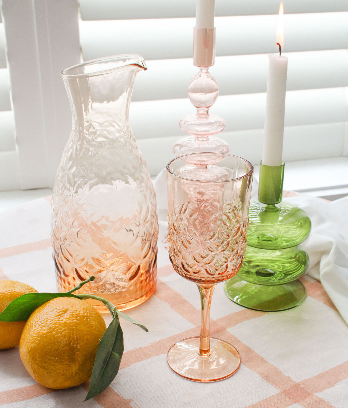 The soft peach hue is genuinely lovely (but just as a heads up, you know, colours might vary batch to batch). At 17x17x29cm, it's big enough for drinks at any dinner party but not so bulky it dominates the table. The pattern refracts light and draws people in, a bit like vintage carnival glass. It's made of sturdy glass and is solid for pouring without being too heavy on the wrist.