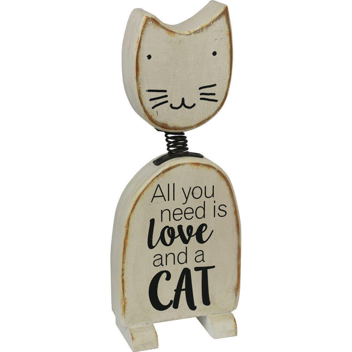 About 33 cm in height makes it quite large presence in any space and considering how large your love for cats really is, you would find it just right. Made of wood, each part of the cat's body has been carefully fashioned and then aligned with each other - especially the head which has been attached to a spring so that a little movement or touch could send it bobbing. Place it on your study table, the mantle, the kids room or simply any space that seldom has been this interesting and you will see it getting all the love and attention. The shabby chicness of the piece is unmistakable as is its love filled message which warms your heart - it says - All you need is love and a cat. The message is as heart - warming as is the figure - the lovely message and the manner in which the face of the cat has been painted on the shaped wood is fun and cheerful in its overall feel.