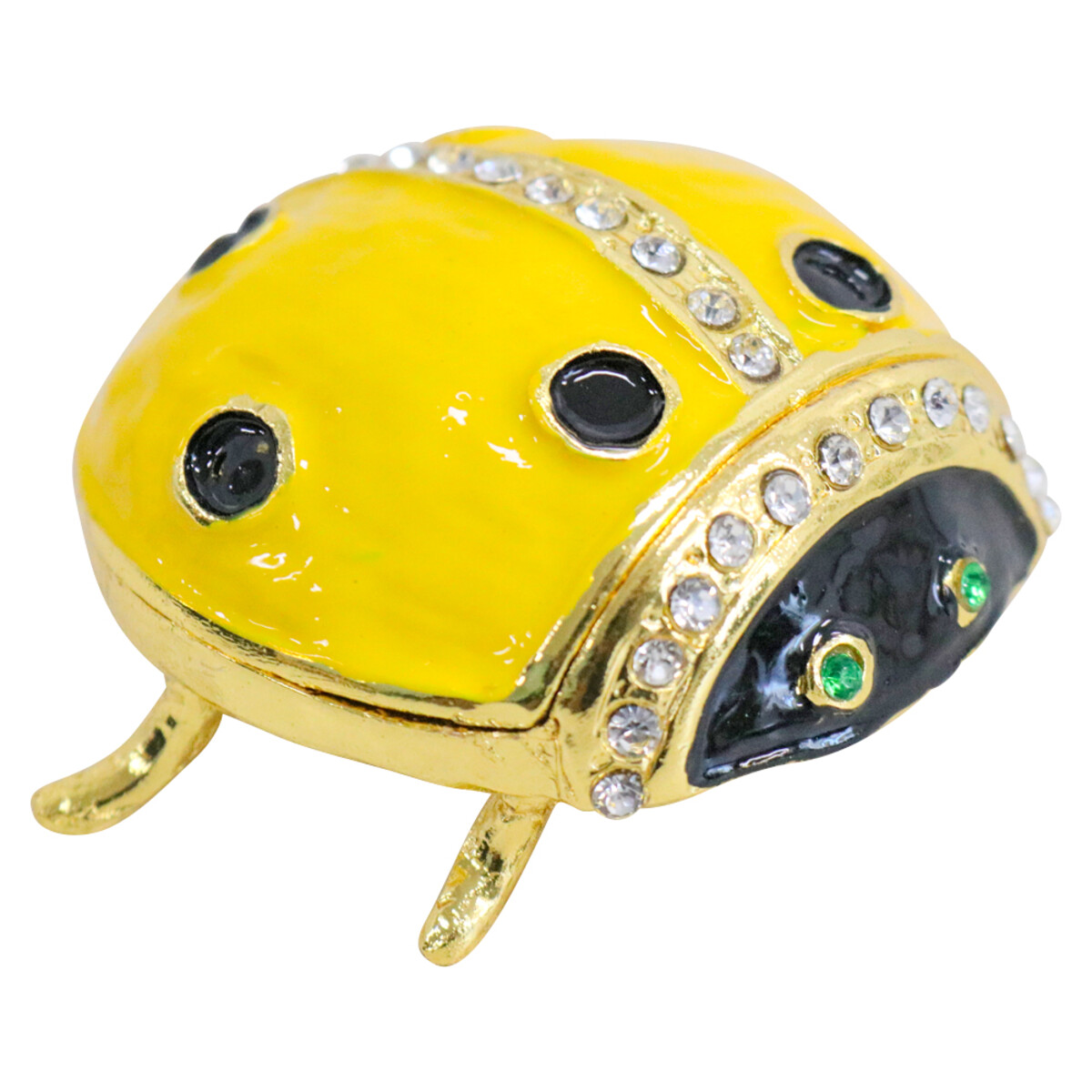It’s made from sturdy metal and is finished with a glossy enamel that reflects light beautifully - the yellow really pops in person! And, it’s got these sweet rhinestone details along the shell, which just lifts the whole design and gives it a bit of glam. People use it to keep jewellery, small trinkets, or even notes - something about that ladybug motif makes it feel kind of lucky.