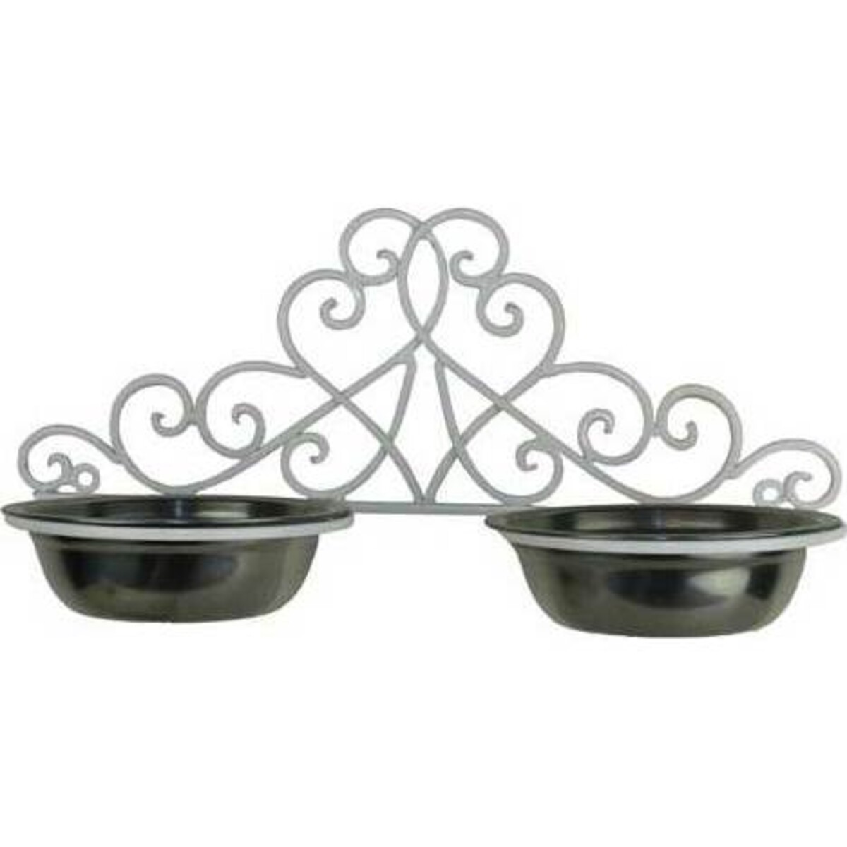 Your ordinary dog bowls these are not. There are two dog bowls that sit in bowl holders which are attached to a beautiful scrolled triangle-shaped background. These are meant to be wall-mounted which is a big asset, especially for senior dogs, so that your pets don't have to be hunched all the way over to eat food and drink water. The bowls can be placed at a comfortable height, and they're removable so you can easily clean and refill them when necessary.