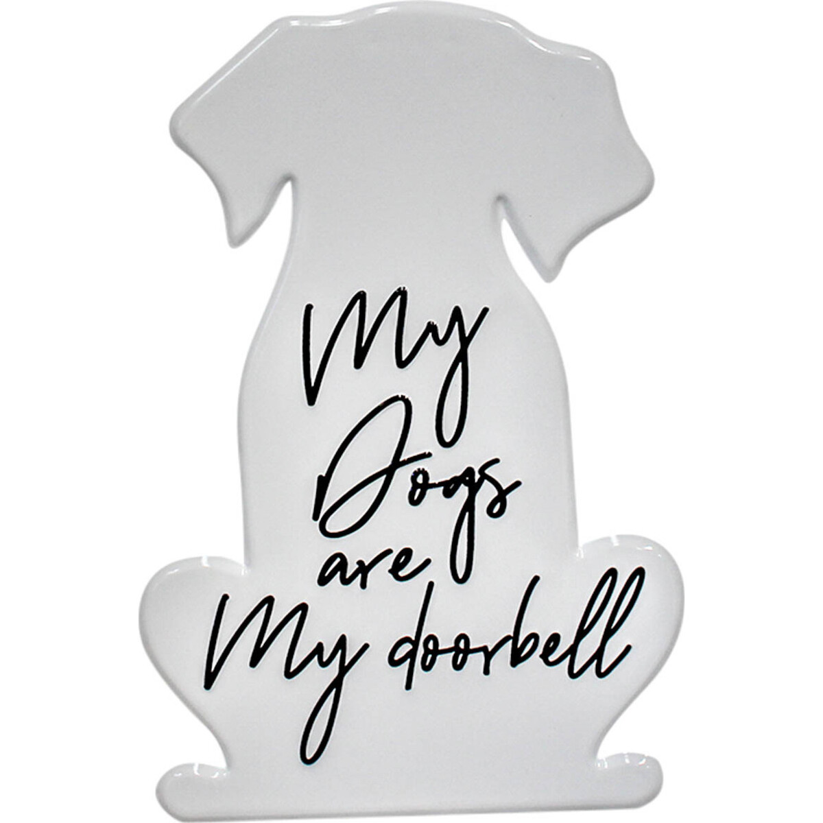 The Dog Sign Dog Door bell is made of quality metal which is artfully wrought in the shape and likeness of a squatting dog. It is then luxuriously painted in immaculate white colour and features a witty black warning statement which reads "my dogs are my doorbell". The sentence is a witty, friendly way of informing coming guests that "we've got a dog, you should proceed with caution when you see them". It is a much more preferable alternative to scary sign posts which reads "beware of dogs, these barks". Apart from being functional in warning guests, they are also a charming decorative way to show we love our dogs.