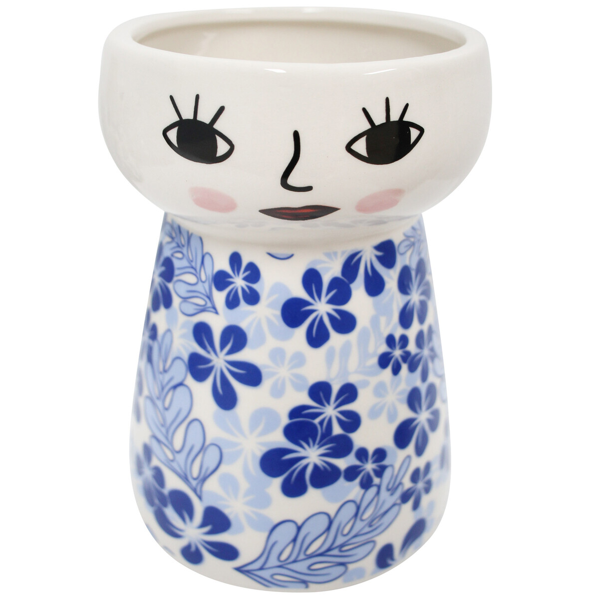 Perfectly suitable for both practical and ornamental use, the Doll Vase Aloha would satisfy all of your customers’ decorative as well as practical needs and sensibilities. The bowl shaped top has beautifully lacquered in pristine white hue while its exterior is ornamented with the face of a doll featuring the eyes, eye lids, nose, a softly curving lip, and blushed cheeks. The cylindrical shaped base is beautifully glazed in colourful floral appeal. The floral glazing is rendered in bright and pastel shades of blue.