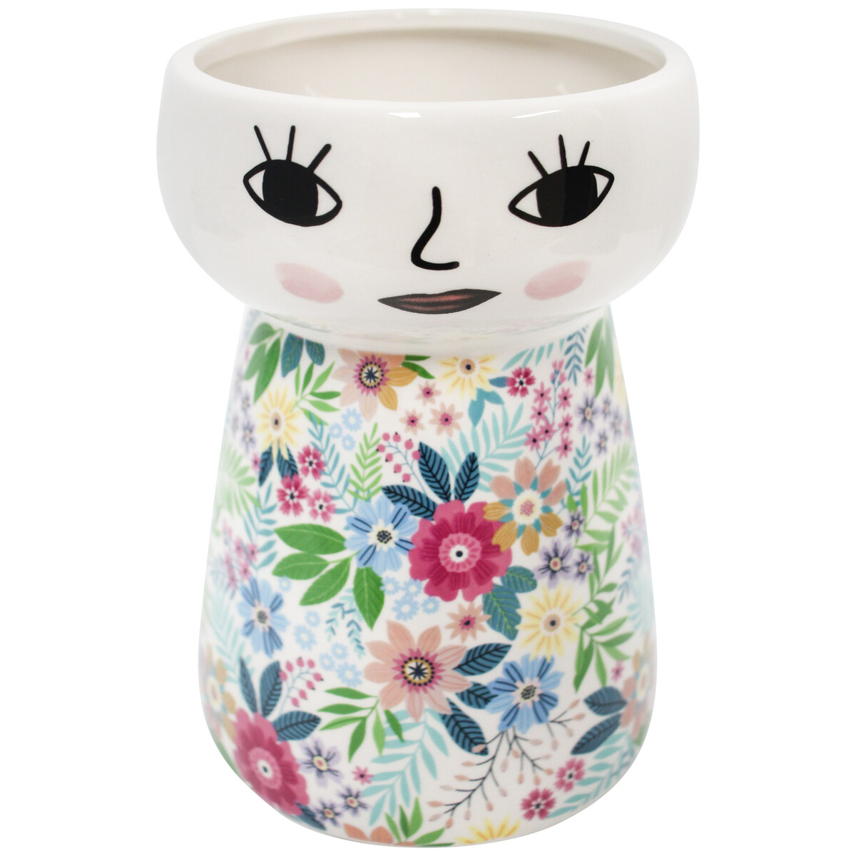 Showcasing a design which features a shapely form in which the top is made in a bowl shaped form while the base is made in an upturned cylindrical form. The bowl shaped top has its exterior beautifully decorated in a form that looks like the face of a young lady showcasing eyes, eyelashes, a shapely nose and lips plus blushed cheeks. The base on the other hand has its exterior glazed in bright colourful appeal consisting of flowers rendered in bright colours of pink, green, blue, yellow, etc.