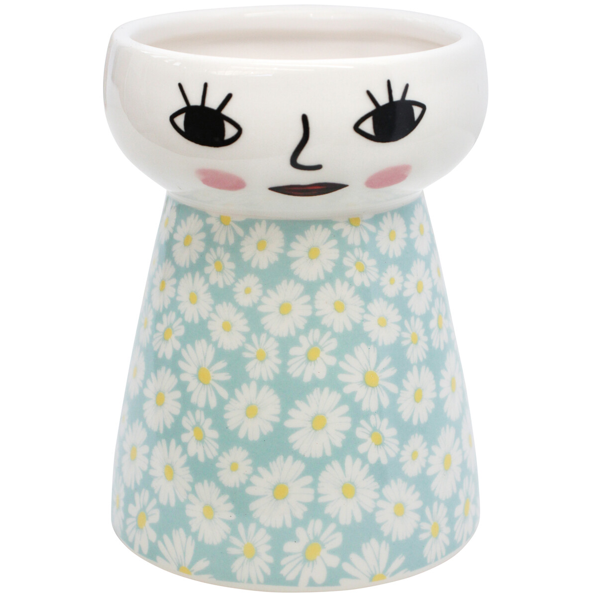 On the side of the bowl shaped portion of this Doll Vase Blue Daisy Sml is the charming image of a doll face characterised by two eyes with eyelashes, a nose, full lips, and a pastel pink blushing cheeks. The cylindrical base is ornately decorated in a pretty general background colour of jade green. On this are several lovely sunflower images which feature white flower petals and a bright yellow centre. This daisy themed vase would make a perfectly suitable gift item.