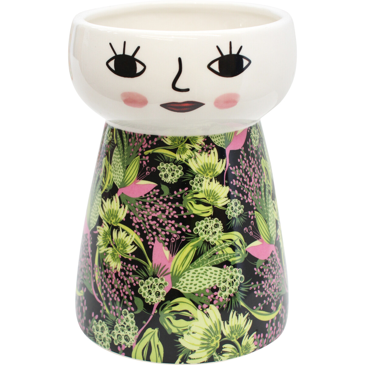 Featuring a smooth textured feel, a distinctively appealing shapeliness, a doll face motif and a charming floral painting, the Doll Vase Fleur Bella is a fabulous decorative addition to both your shop and the spatial setting of all your customers who would instantly recognize and appreciate the decorative beauty which this Doll Vase Fleur Bella possess. The cylindrical shaped portion of this vase has its exterior painted with a delightful array of colourful flowers. This will help enhance every of your customer's décor.