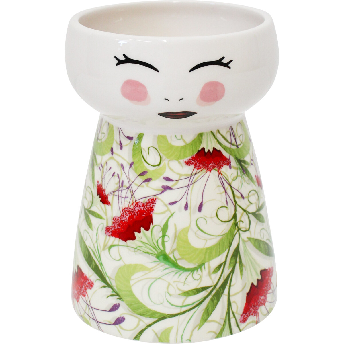 Imagine giving your customers the opportunity of decorating their living and working spaces with the use of flowers in the most strikingly charming way? They certainly would love it. This is the opportunity that is made available with the use of this Doll Vase French Flower. The vase is an exquisite ornament in itself as it is glazed with a floral finesse in several brightly appealing colours. The glazed embellishment is done in both light and deep shades of green, red and electric violet over a white background.