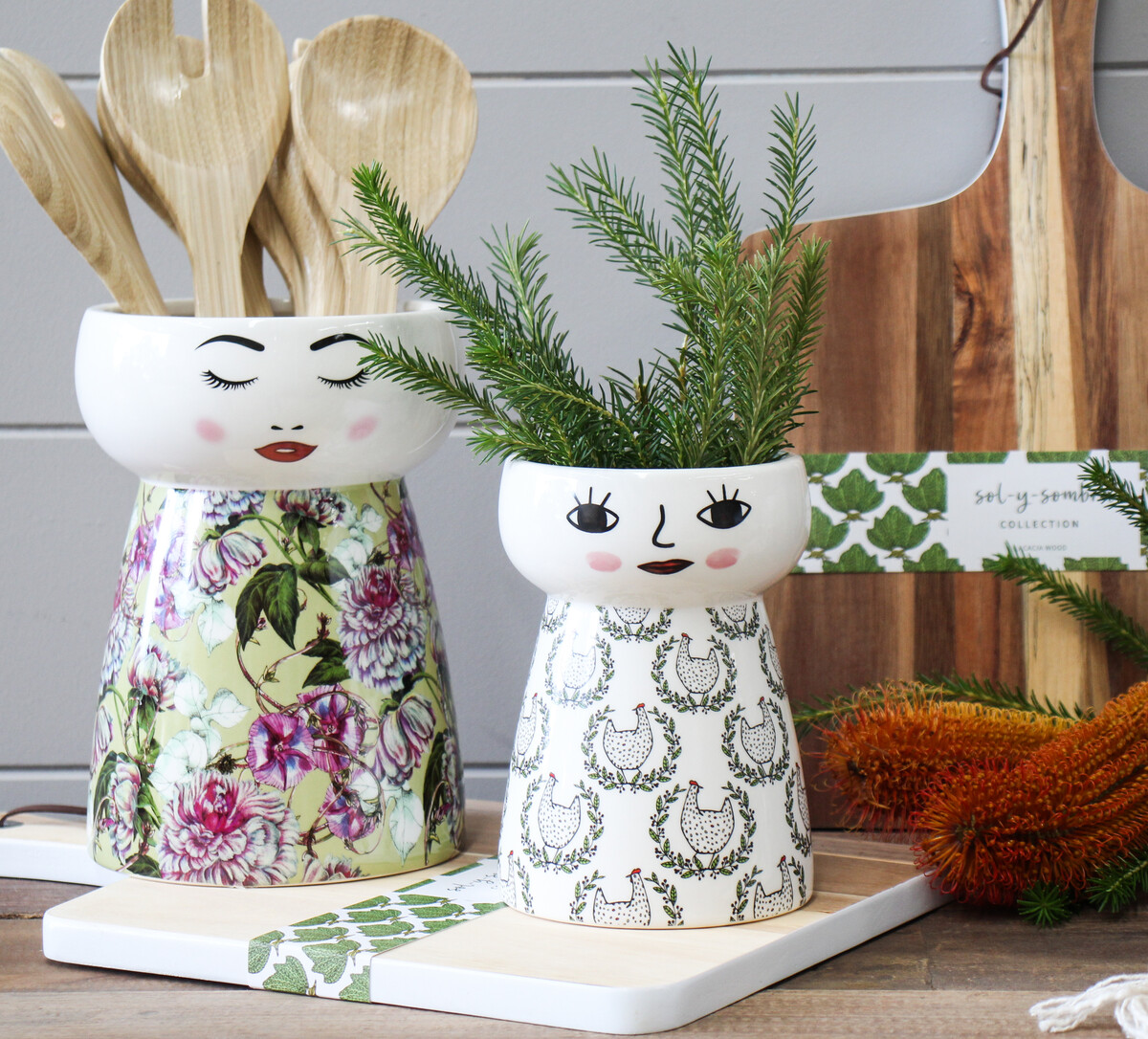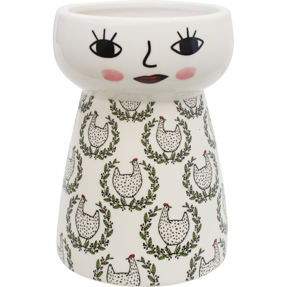 While the top of this Doll Vase French Hen is made in the form and shape of a bowl, the base is made in an upturned cylindrical shape. The top is decorated with the motif of a female doll which has her face depicted through the presentation of wide - opened eyes with eyelashes, nose, painted lips and blushing cheeks. Beneath this, on the exterior of the cylindrical shaped base is the presentation of a French hen looking backwards while the hen is surrounded by a wreath of green lovely flowers.