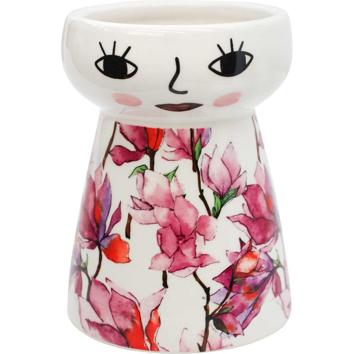 The Doll Vase Petite Sml features a classic vase made through the use of premium quality dolomite material in a distinctively appealing shape and design. The top of this vase is shaped like a bowl while the base is shaped in the form of a cylinder. The bowl shaped top has its side ornamented with the image of a woman who is active and at alert. The cylindrical shaped base however, is painted in lovely floral patterns which features alluring flowers. The flowers have pink coloured petals with some occasionally having one or two red coloured petal as well.