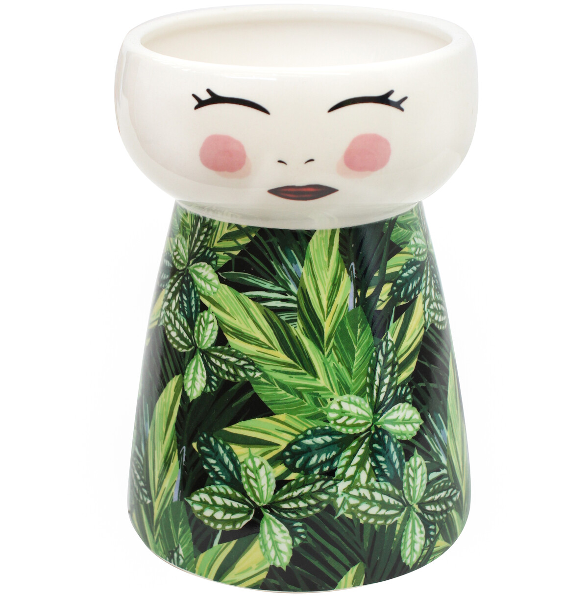 The Doll Vase Rainforest has its bowl shaped top featuring the depiction of a doll face which has a satisfied expression on its face. This is made possible through the painting of its eyebrows, pink blushing cheeks, nose and painted thin painted lips. On the cylindrical base of this bowl shaped vase is the artfully painted image of a typical rain forest. Like every tropical forest, the image contains portrait of both thin and wide leaves. Noticeable in the painting is palm tree branches. This makes it especially perfect in blending with every decorative environment.