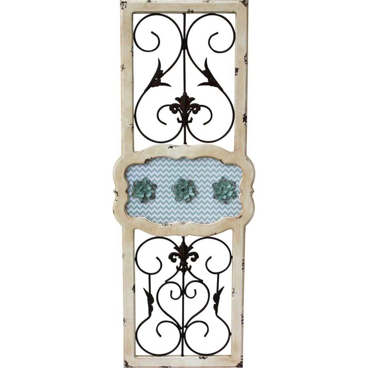 Door Panel Chevron Fleur is a door panel of attractive design which measures 46x2x120 cm. It is constructed using beautifully - patterned metal on the interior part, with wood being employed for creating the frame. Three floral pieces of artwork can be seen at the mid - section, which is bluish - green. People considering choices of door panels for their homes and other forms of buildings should find Door Panel Chevron Fleur a delightful product. Use of metal for the interior patterns reinforces its security aspects, whereas the wooden frame gives the house a striking architectural contrast.