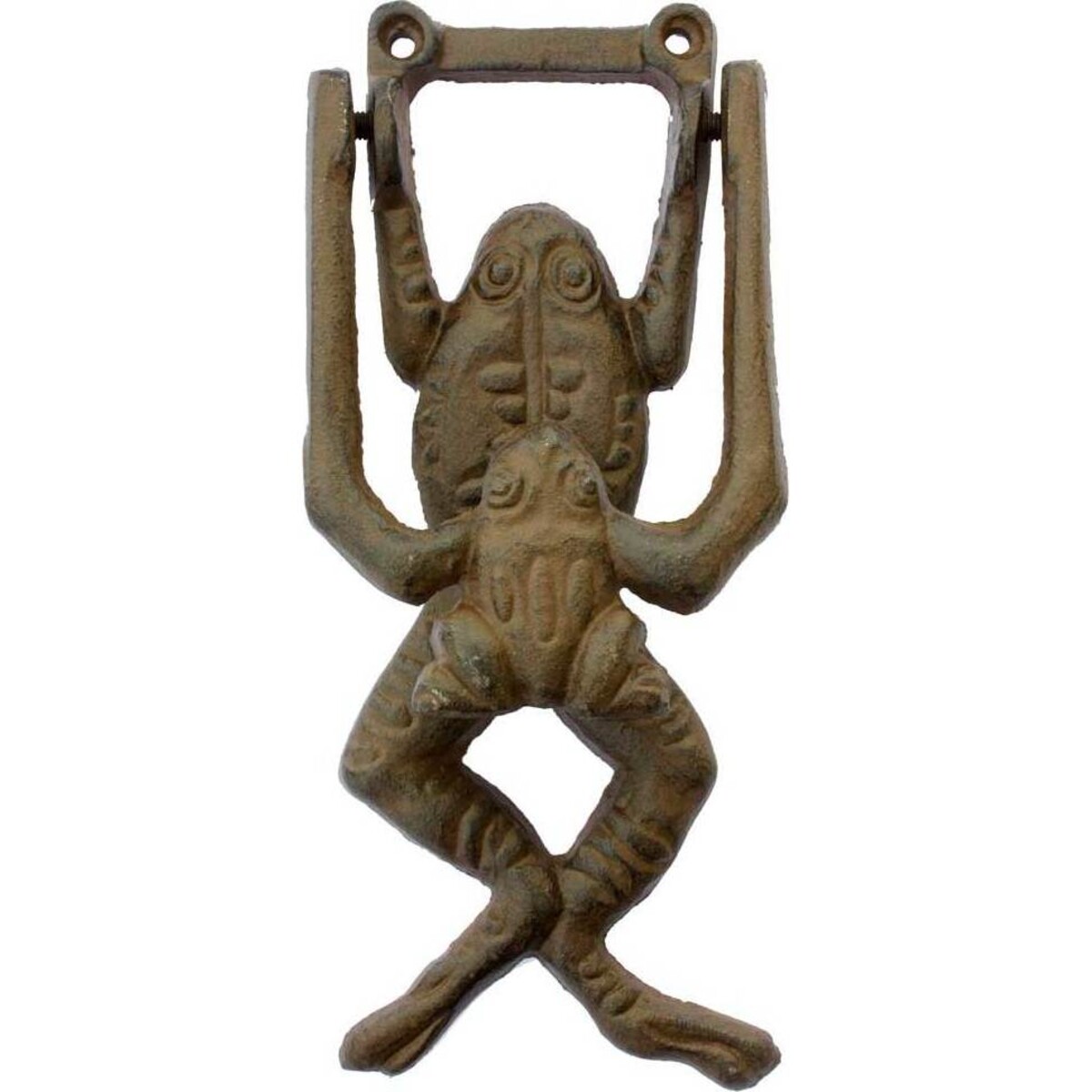 Introducing the Hanging Frog Doorknocker. This brown decorative piece consists of a baby frog sitting on top of a larger frog, both of which are just waiting to hop onto your front door. Sure your guests may not use the doorknocker and prefer the doorbell, but it can still make an excellent piece to display in the front of your home. Isn't it time you got something to display that you love so much more than your current doorknocker?