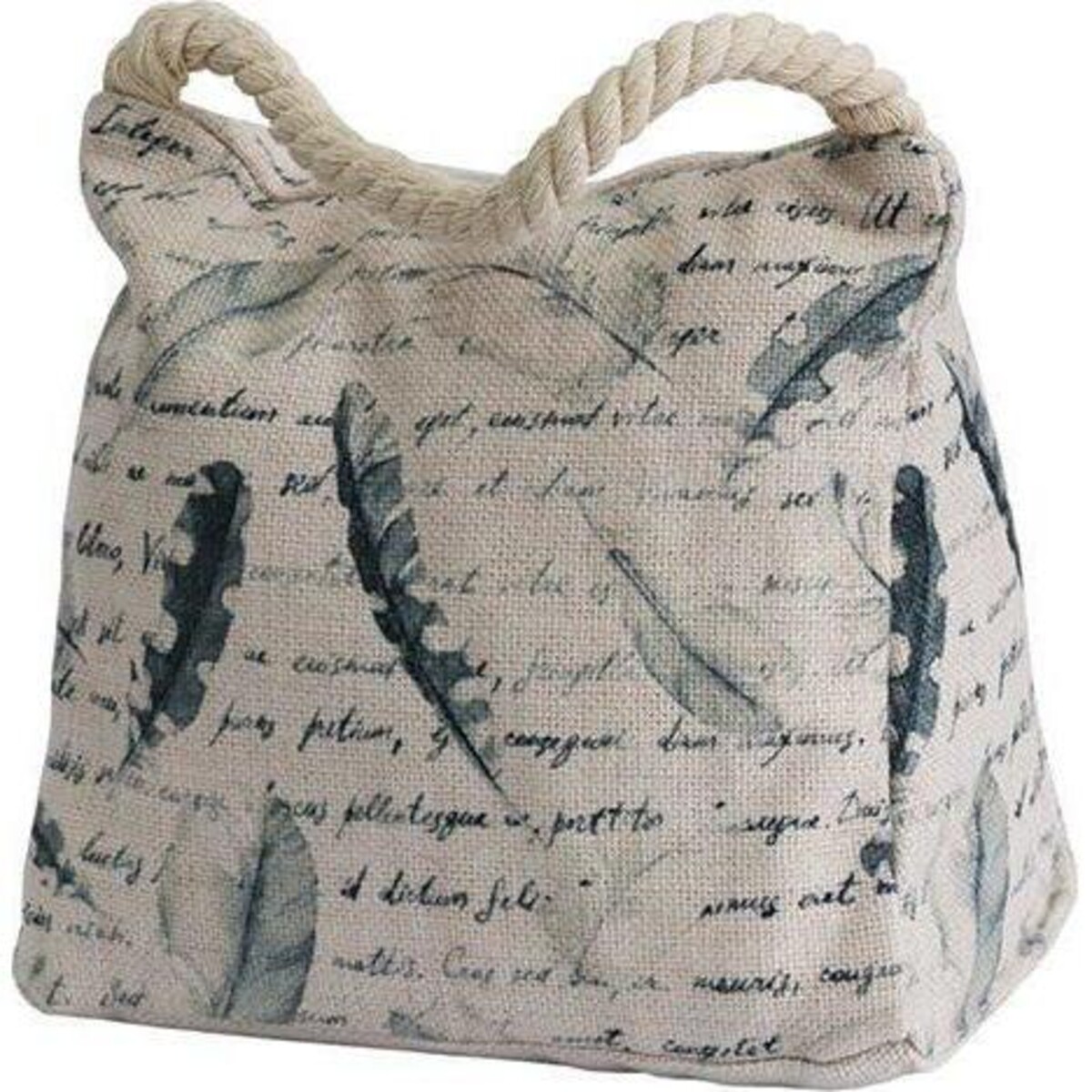 Doorstops sit at the door barely getting much attention - but when they have interesting designs and shapes that add to the look of that space too. The humble doorstop has a functional role that makes them stay close to the door, on the floor and generally they are there all alone, which is also the reason why their looks matter as much as the canvas on the wall, because they sure will be noticed. Creating a semblance of elegance in its looks is the lovely doorstop that sits rather well on its broad base and carries out its duty with such style. The rope handle allows t to be picked up easily and its height and weight makes it rather simple to keep the door ajar. The jacket n the stop is made of linen in an off white colour with a print. Very chic ad stylish, it is sure going to be noticed for its prettiness as much for its functionality. Could be used in any part of the house. Its height is about 12 cm and its width and depth 18 cm each. The feather print on the linen canvas makes the appearance rather pleasing.