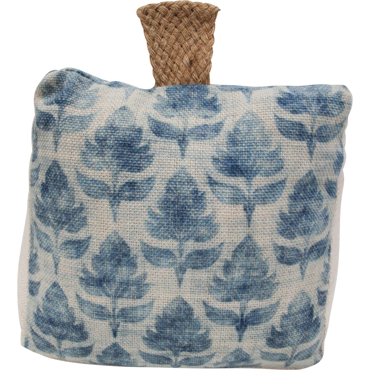 Doorstops are an indispensable article in any home and they do their job ever so quietly; be it to keep the door wide open or slightly ajar-they firmly place a grip on the floor disallowing any wayward behaviour by any door , even on the windiest of days. Here is one designed rather charmingly in terms of its pretty blue print on its off-white linen made exterior. The handle made of burlap allows a firm grip, making it easy to carry it to the place of your choice. The doorstop also makes an impression with its sturdy styling-the stitches are hardy and will hold the weight of the filling without giving way. The blue and white colours are the kind that will fit into any décor-even the entryway of your home.
