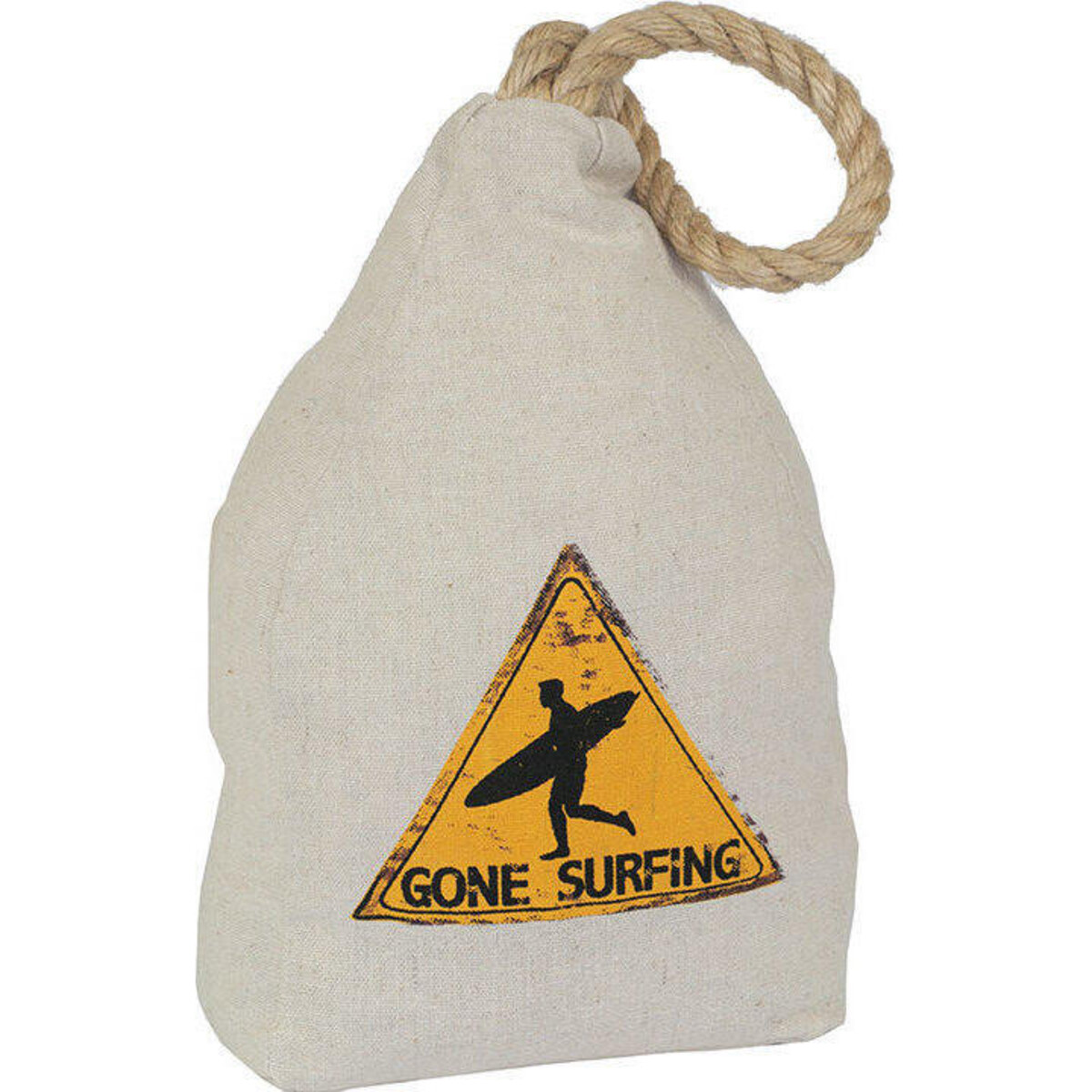 This doorstop will be the perfect means to add a tiny bit of cheer to your space while hard at work holding on to a heavy door and making sure it does not slam shut. There are homes near the sea or in rather windy places - or there are days when you want the door to be slightly ajar to let the breeze in - what could be more useful that this sturdily built doorstop that performs just that job. Made with the intention of keeping the stuffing inside safe and in place, the seams have been kept strong and the fabric supports the job profile of this accessory for your home. The Gone Surfing label in yellow adds such a pop of colour and the cotton rope handle makes the relocating of the door stop easier . You have one beach home worthy doors top here that will lend lots of style to your space and make doors and spaces around safe. The doorstop is 24 cm tall and with a width of 16 cm and a depth of 12 cm.