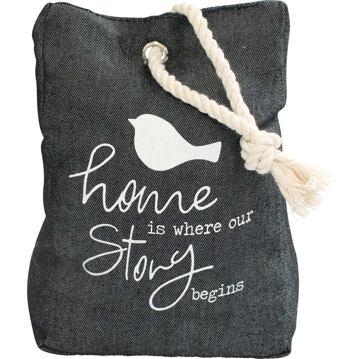 Keeping doors from slamming shut on windy days-or only a little open to let the fresh breeze in -should always be easy when you have doorstops that take the responsibility pf keeping your doorways safe and functioning just the way you want. Delightful design in grey with the lettering in white makes it subtle yet strikingly attractive. It carries a message that makes it superbly homely-Hoe is where our story begins instantly connects with the family and hearth loving concept. The rope hold on top allows easy carrying and the tough material will hold the weight which makes this doorstop effective adds to its durability and toughness. Will grip all kinds of floor whether carpeted or otherwise and will graceful and inviting when used in any part of your home.