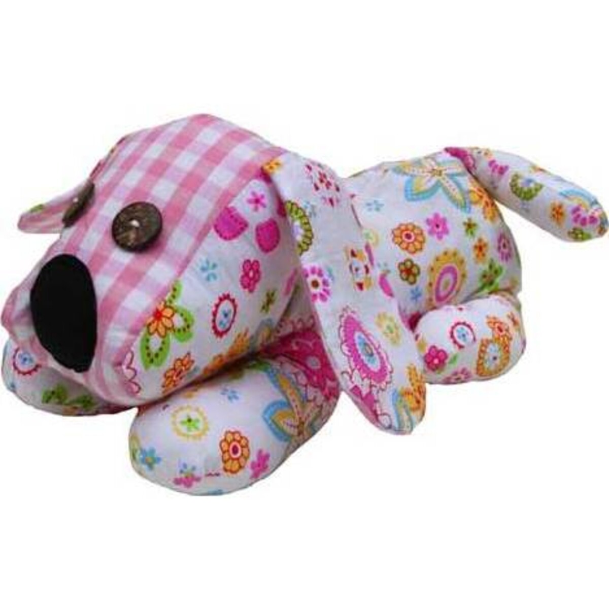• Fabric is polyester - pink and white check on the face and under the ears, and white with calico flowers on the rest of the body.