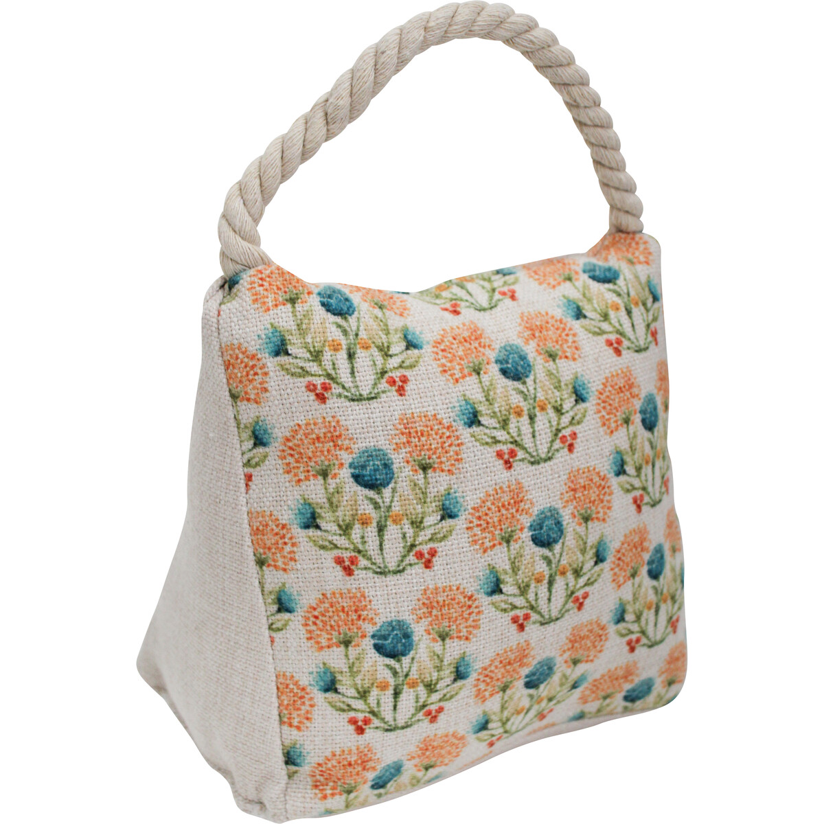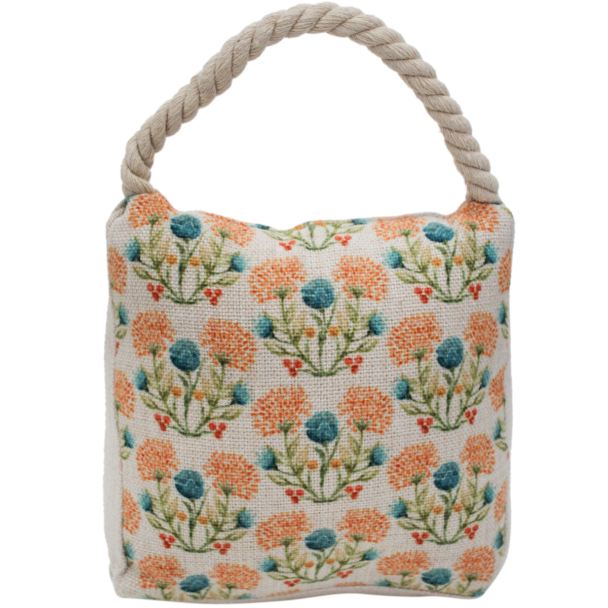 Measuring 18 centimetres in length, 12 centimetres in width and an equal 18 centimetres in height, this Doorstop Whimsical Floral has a visual stylish appeal that will blend into every kind of décor your customers may have created or intend to create. It would easily blend into modern, minimalist and even traditional themed décor given its choice of floral motif. In order to ensure ease of hanging by users, it also comes with a rope handle which makes hanging relatively easy. The floral image is rendered using teal, green and orange hues over an ash background.