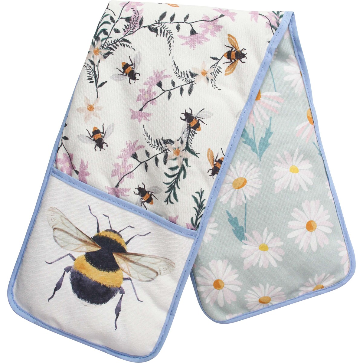 Heat resistant and amply proportioned to allow you versatile usage in the kitchen whether to use for oven dishes or for your usual kitchen usage. The long glove has tow sides each of which shows off prints that make this piece all the more special and attractive. The bee print gets partnered by flowers on the reverse side. The pockets on the ends are wide enough for you to insert your hands and get a great grip. Despite the layering that keep your hands adequately well insulated, the glove does not feel bulky or stiff. The length gives it a certain amount of versatile usage. Looks attractive when not in use as it brings Spring time colours with its nature inspired print.
