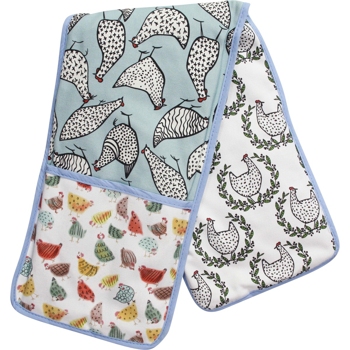 The double glove allows you to insert your hands into the pockets on two sides-has adequate layering and padding but at the same time makes it easy for you to get a better grip. You could fold it and use it like a base for landing super-hot oven fresh dishes and use it for gripping casseroles and pans without fear of slippage. Because of less of bulk, you can actually hold better. The length of the double glove is covered in a fine printed material with both sides featuring two different prints. The print in pale colours brings to the space a lovely cottage and farm kind of flair. Will also work well as a hostess gift and could eb given to a baking enthusiast. Can be hung from the loop attached on the edge.