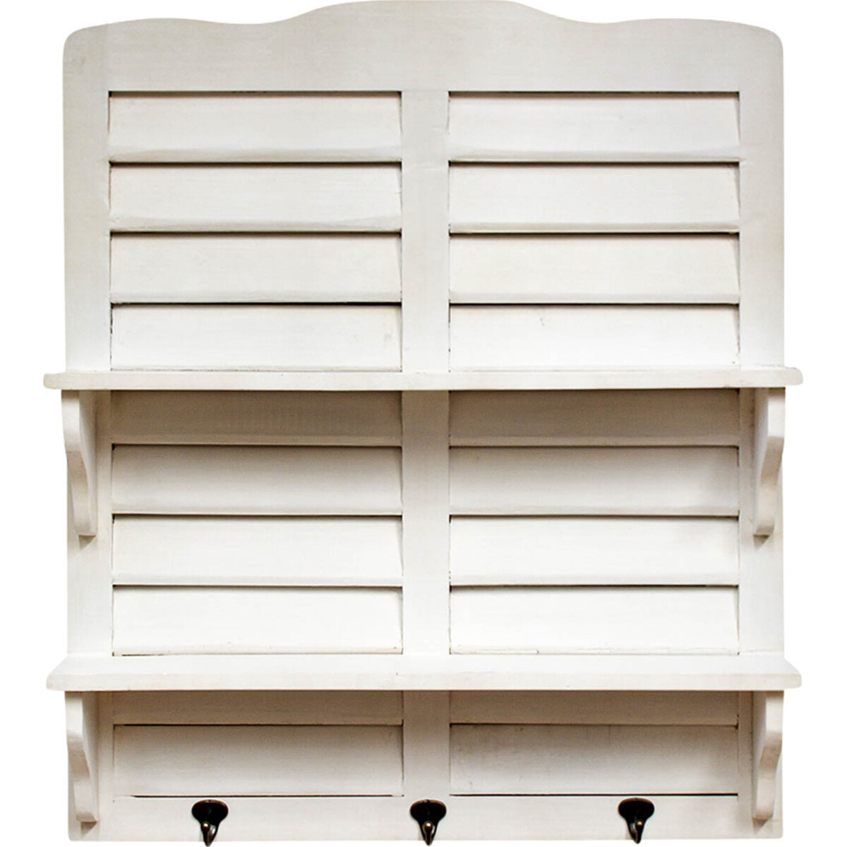 Apart from its functional sturdy design, the Double shelf with hooks has a decoratively alluring outlook due to its shapely design and stark white colouration. The 100% natural wood shelf is painted in white while with two different shelf tier while three metallic hooks in black protrude from at the base of the shelf. The shelf can be nailed or screwed to the wall while items ranging from books, pots, serving ware, dining ware, perfume, powder, lipstick, lip gloss, wristwatches, keys, phones, etc. can all be placed on the shelf depending on the location of the house where it is being used. On the hooks also, items such as belts, ladles, ties, graters, dog leads, coats, hats, bags, keys, etc. can all be hanged on the hooks.