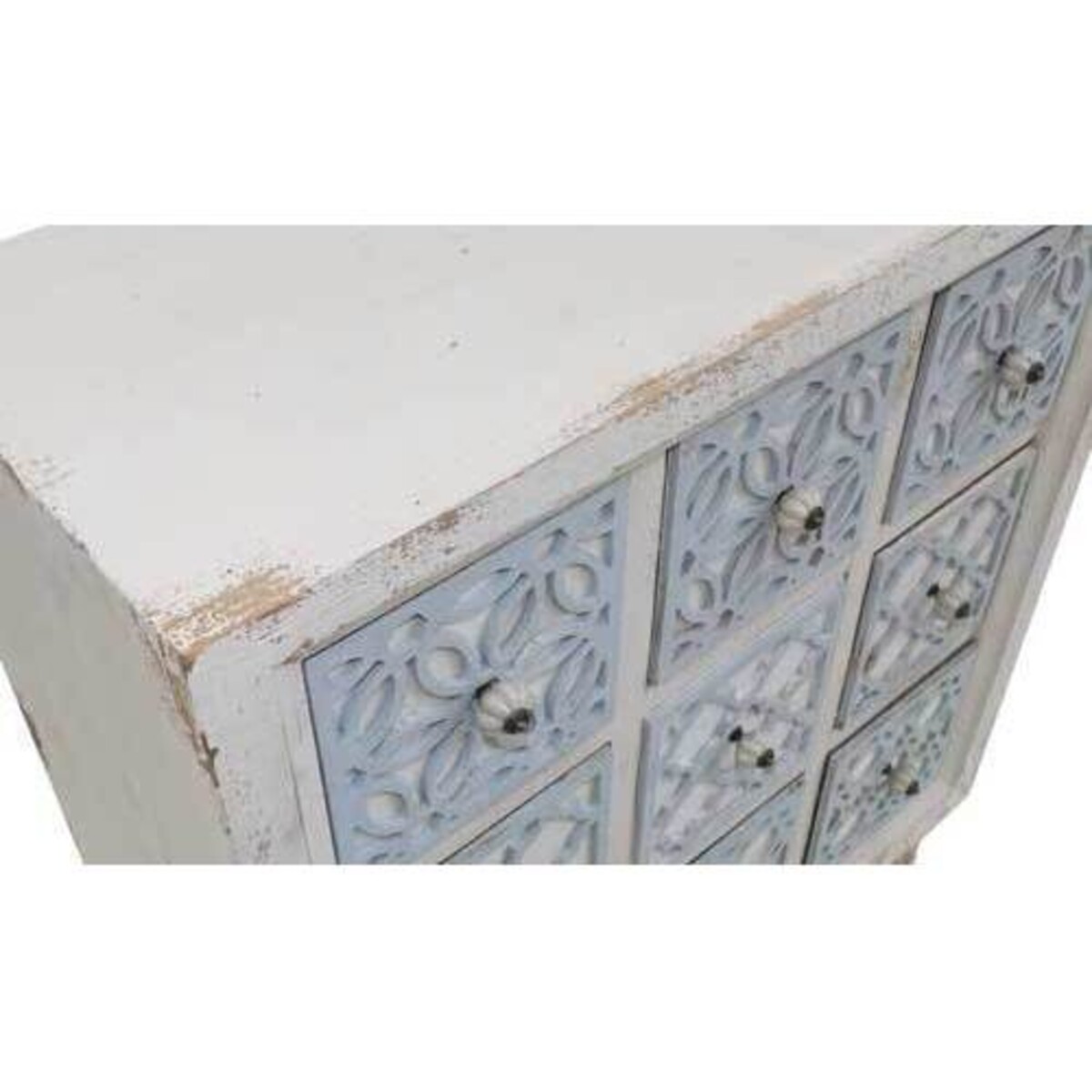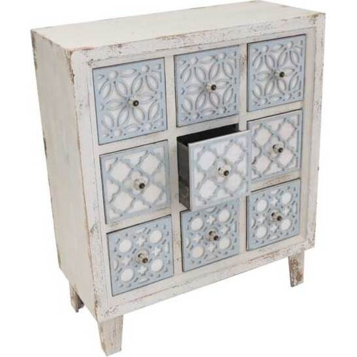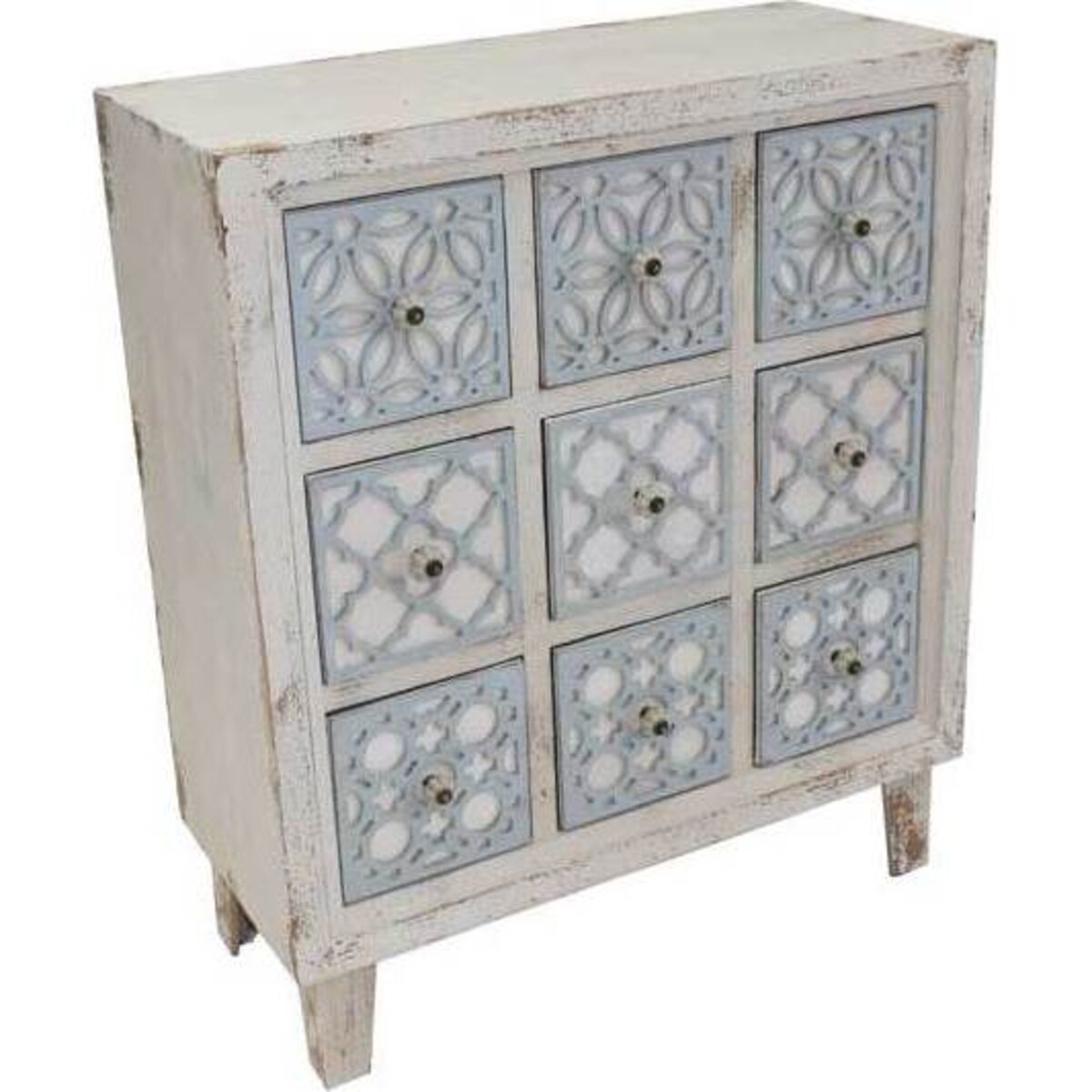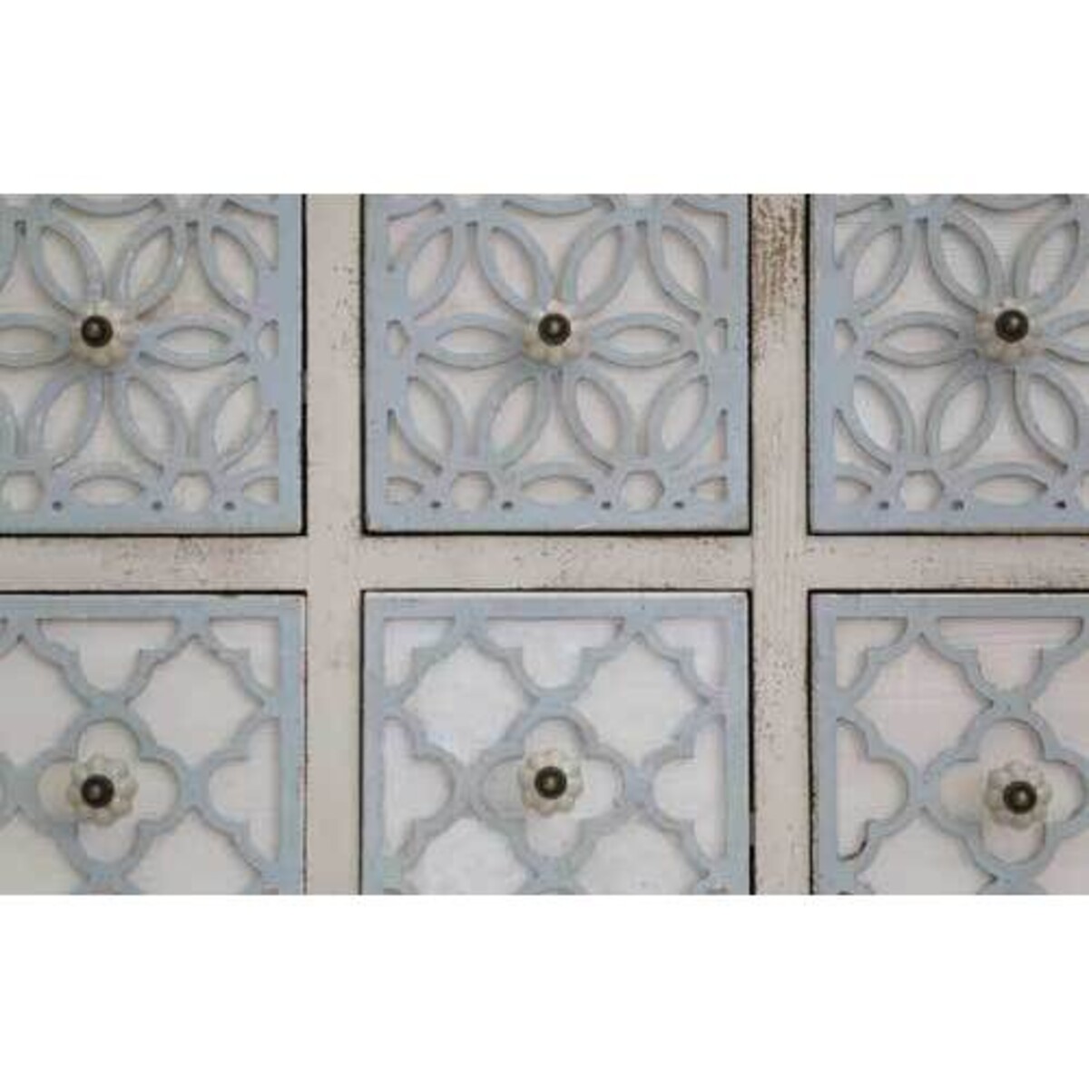 These beautiful cabinets are white in colour and feature a bluish-grey cut-out design on the nine drawer fronts. Small decorative drawer pulls are on the front of each drawer to add a little extra style and function. The cabinets sit on four small and stout legs so you can ensure they're sturdy while also allowing for some storage space underneath. These cabinets are ideal for storing small items some as jewellery and makeup. Strategically worn to give them an aged appearance, they look like they've been lovingly used and cared for over the years in the best way possible.