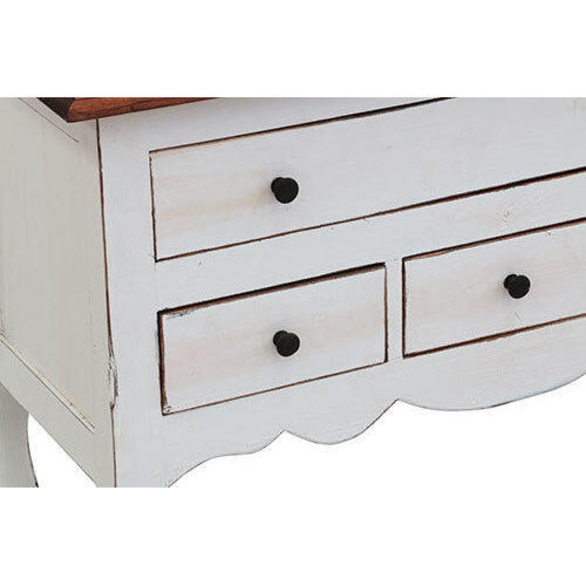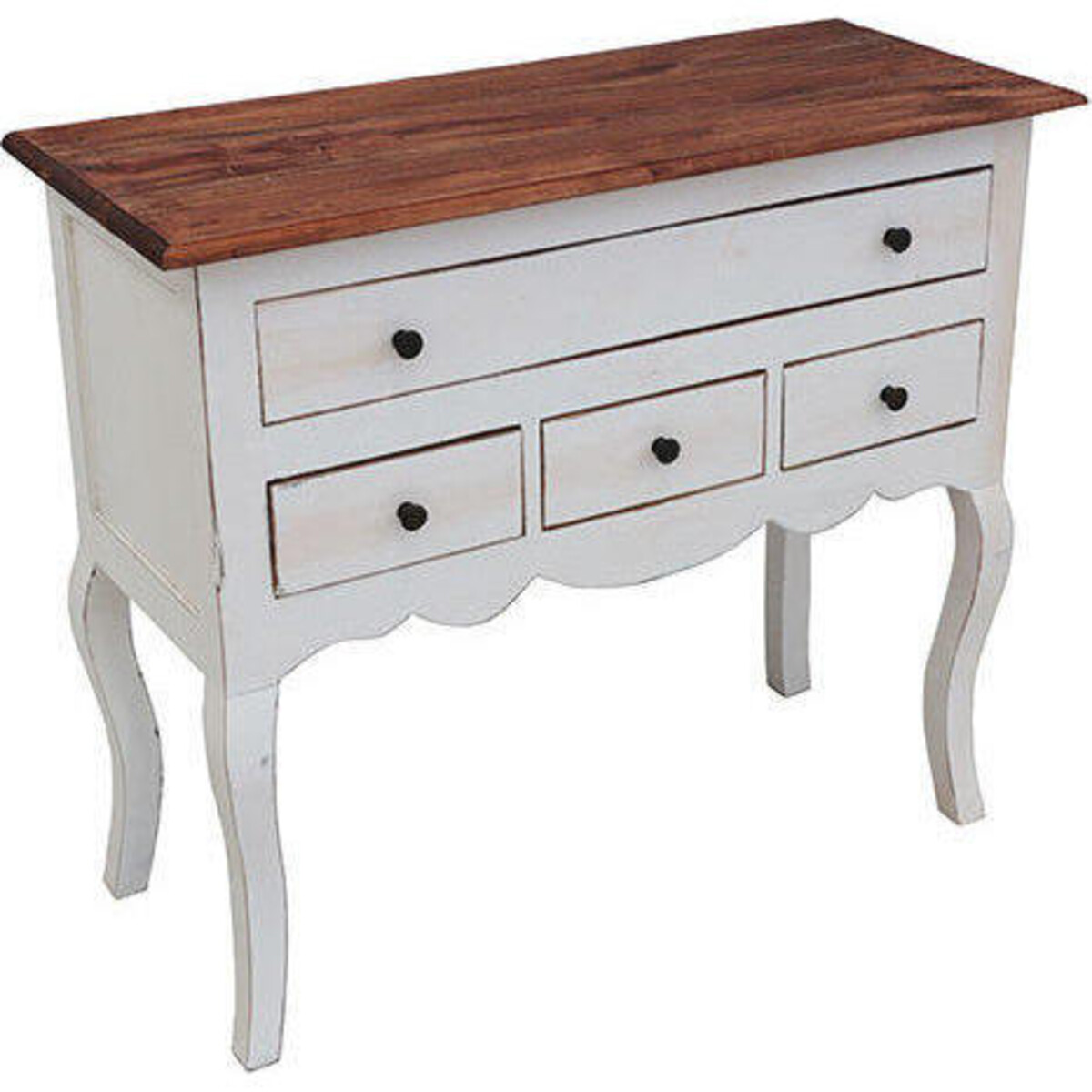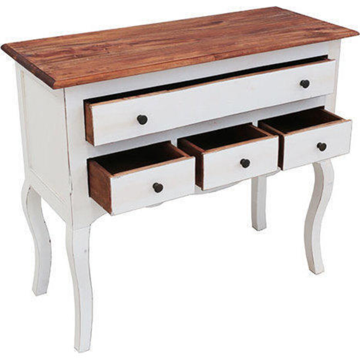 Made from sturdy quality mahogany wood, this chest of drawer could function like any other side board or could double up as an utterly desirable console table that could also have some much needed storage. Anyone who has had space crunch at home knows the value of having that extra drawer or a cupboard and the design featured here combines all of those needs perfectly. Suited as much for the dining room as it is for the entrance of the house and the bedroom - it will make space as much for your linen as it would for cups and saucers or bowls. The table is about 80 cm high with 90 cm length. The top is all brown and left with its most natural of looks. Could combine easily with all other wooden furniture. The rich vintage feel comes from the white and brown combination. The inner portion of the drawers remain the same wooden colour. The smooth to pull drawers and the neat finish given to the top make it worth displaying in the more formal parts of the house. The lovely curved wooden legs show the class and mastery of craftsmanship. A simple design yet with a touch of delicately built in glamour that leaves you wanting it placed in several places. This side board has one longer drawer on top and three smaller ones below that.