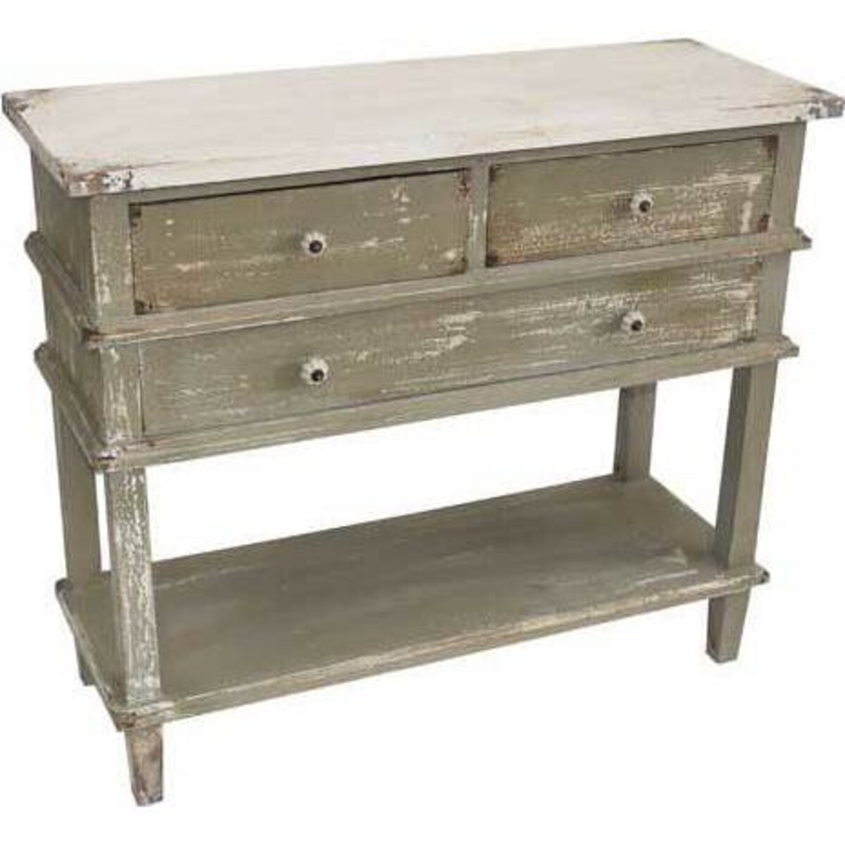 If storage space is what you desire, you'll have plenty of it with these consoles. With two small drawers at the top and a second larger drawer, there's ample room for you to store away all the items you want to. A shelf at the bottom allows for additional storage. Comprised of fir and MDF, these pieces are beautiful as well as functional. Small decorative drawer knobs are the fabulous finishing touches to these consoles. While they're great to put in almost any room, they would be especially lovely in rooms decked out in a cottage style.