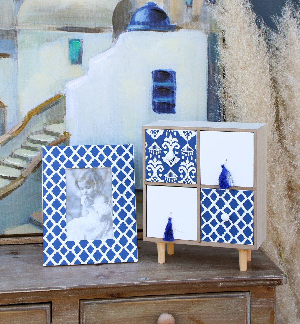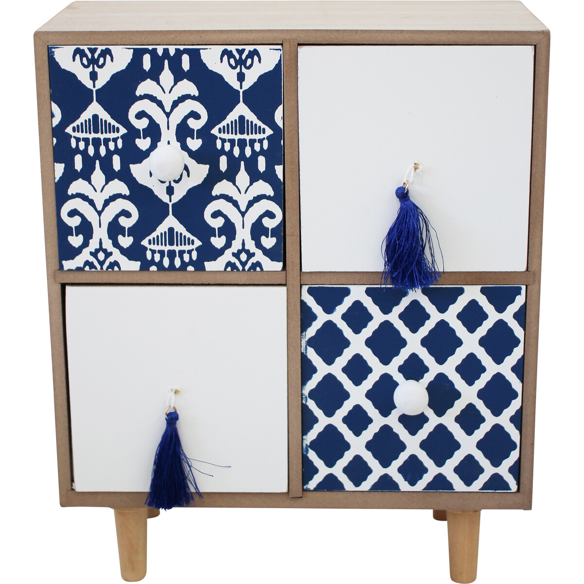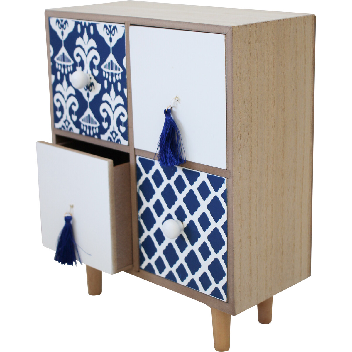 Standing on four sturdy legs, the Drawers Blue Pattern Sqre is crafted in a portable sized dimension which measures 21.5 centimetres in length, 10.5 centimetres in width and 26.5 centimetres in height. This aesthetically crafted drawer showcases a pop of colours and patterns as it has four drawers. The first drawer showcases blue and white floral patterns while the second and third drawers showcases an immaculate white painted drawer and blue dangling tassel. The fourth drawer is also a stylish drawer with blue and white square patterns.