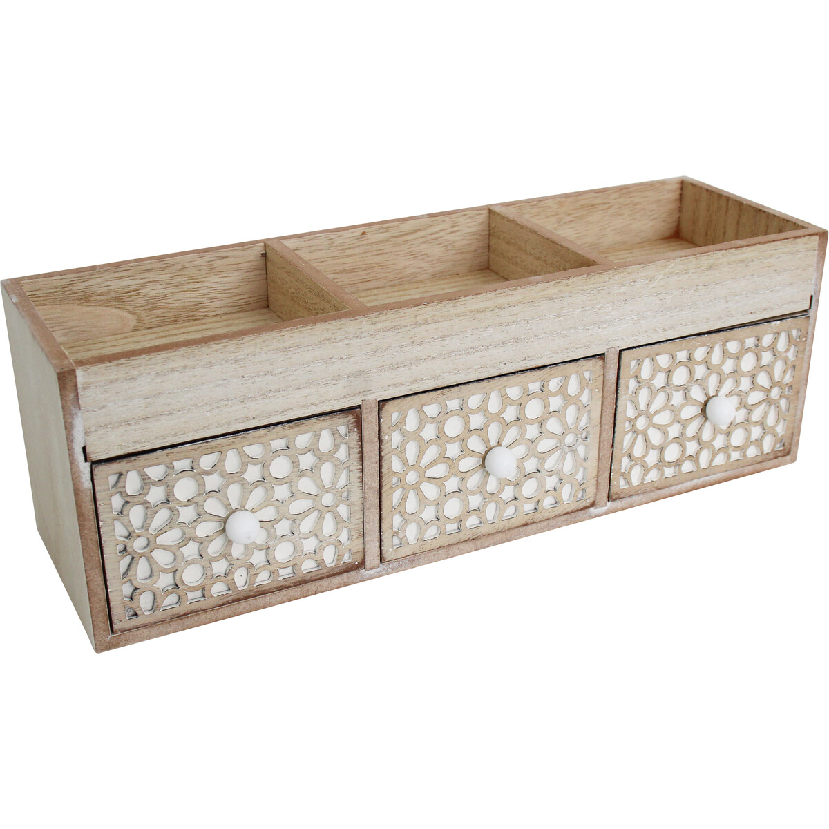 Crafted using only high grade medium density fibreboard materials, this Drawers Daisy is made in a design that is more than practically functional as a drawer piece of furniture. It is made in a rectangular, long dimension which measures 32.5 centimetres in length, 10 centimetres in width and 11 centimetres in height. It has as much as three drawers which have their lids ornamented in similarly shaped sunflower patterns. Apart from these three drawers, at the top are also three demarcated spaces which can also be used for storage purposes.