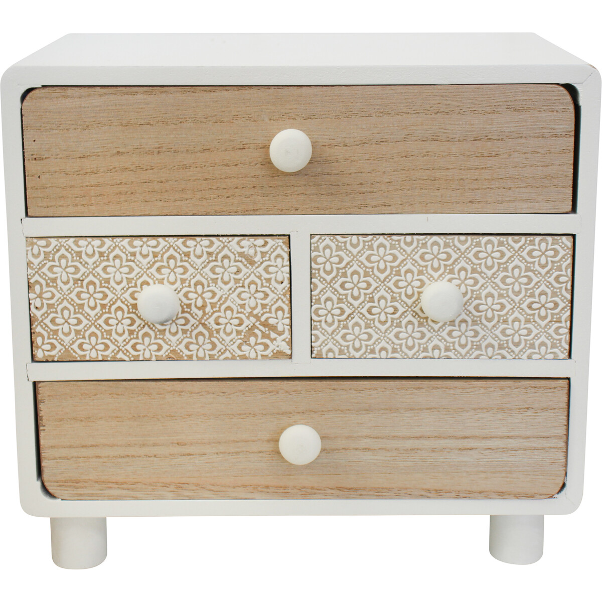 Finding the right accessory to wear each morning could be a challenge if you don't keep them well sorted and easily within reach. Helping you along the way is this table top organizer whose design aesthetics and great many little alcoves will help you keep all of those little articles that are usually hard to find. Made from MDF, it sports a gorgeous pattern and soft pastel colours sure to make your dresser top look all the more attractive. Stands on four round peg like legs. The drawer on top and the bottom are long and the ones in the centre are smaller. It is three tiered in its structure -all of 23 cm in height and 25 cm in length. The drawers are smooth while opening and will easily hold a large number of your everyday wear trinkets. Will wipe clean with a cloth to show off its beige and white pattern as stunningly as ever.