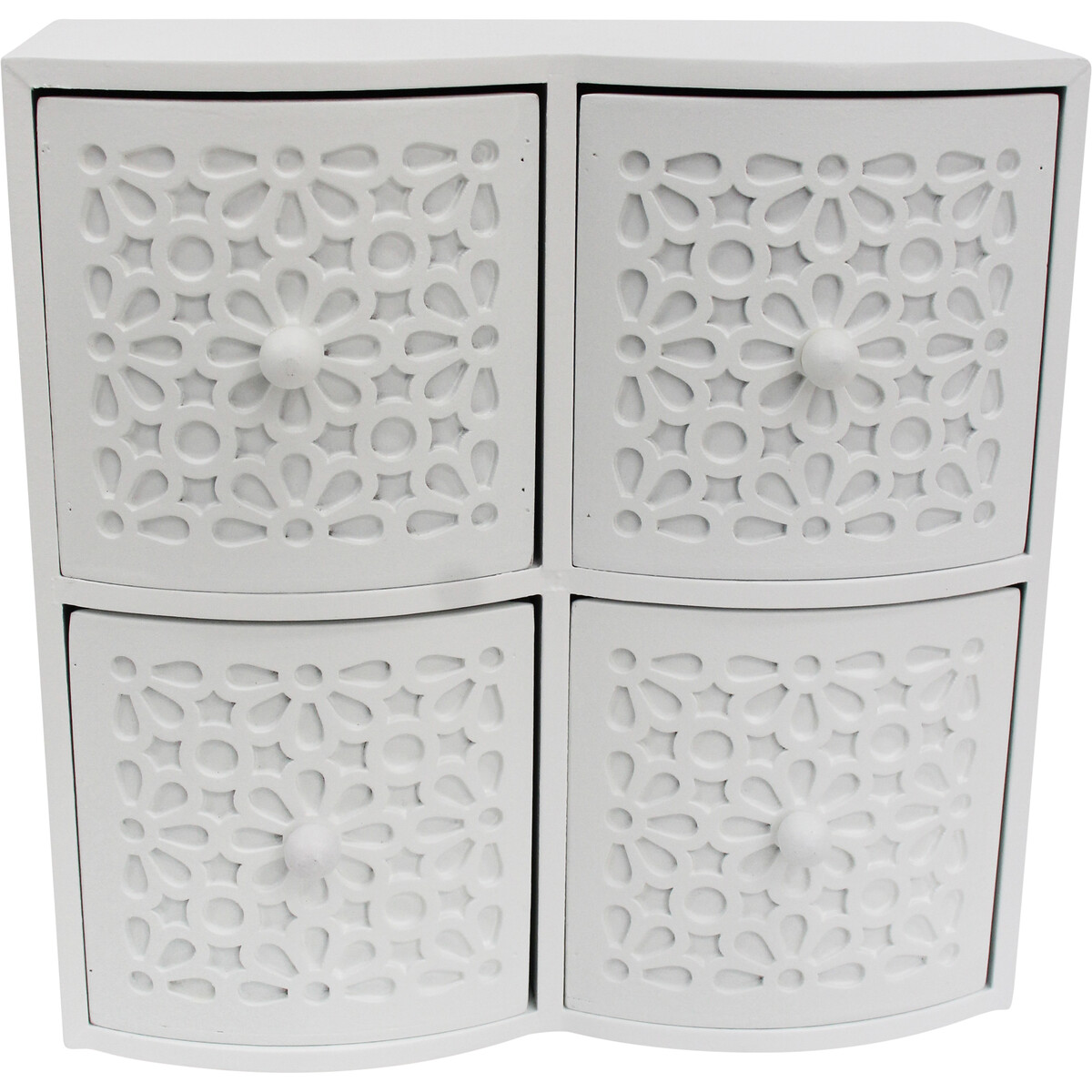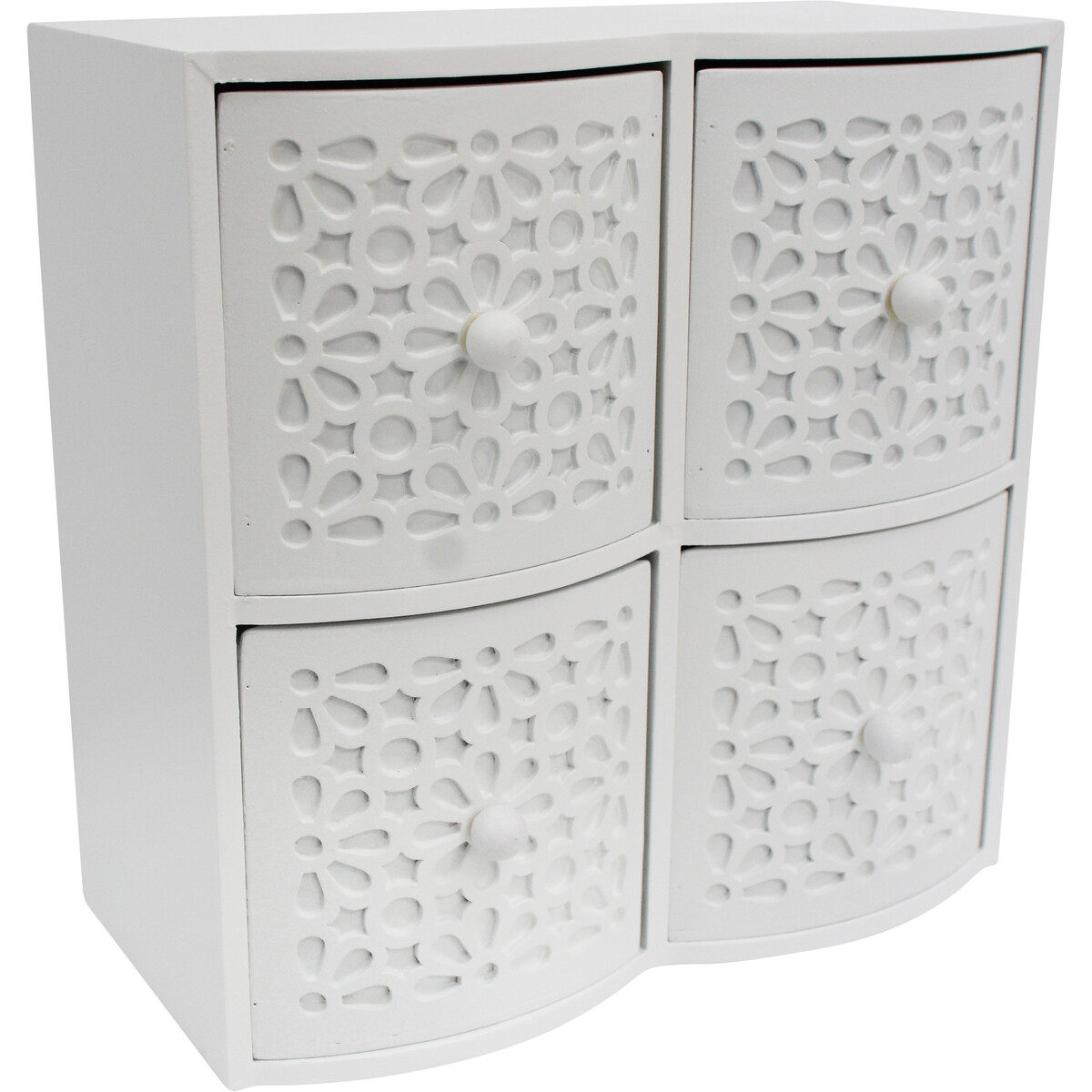 Here’s one to bring a bit of personality to home or office décor. Our Ornate 4 White Drawers are an easy crowd-pleaser - both practical and visually interesting. Four equally sized compartments, all stacked in a neat square, each with it’s own carved-out daisy pattern - not a bad way to organise things. Knobs that fit comfortably between fingers give access to spacious drawers, all contained within a sturdy MDF shell. That white finish does wonders for its appeal and really brings out those playful daisies. Plus, this design makes the whole thing really versatile too. Amongst other whites it’ll blend right in. Add more colour and it makes a great base for everything else to stand out from. For bedroom, bathroom or even the office, it brings a calming air and makes keeping things in order just that little bit more joyful. All while only taking up 30x30x8.5cm of precious space on the countertop.