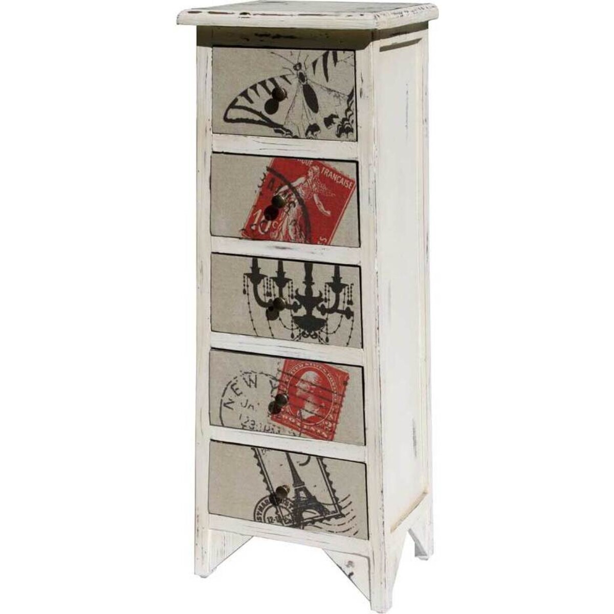 The individual drawers are in light grey with black button style handles. But each drawer is decorated individually. For example, the topmost drawer has a sketch of a large butterfly, the second has a red stamp, and the third shows a chandelier.