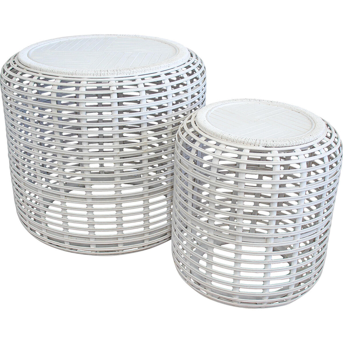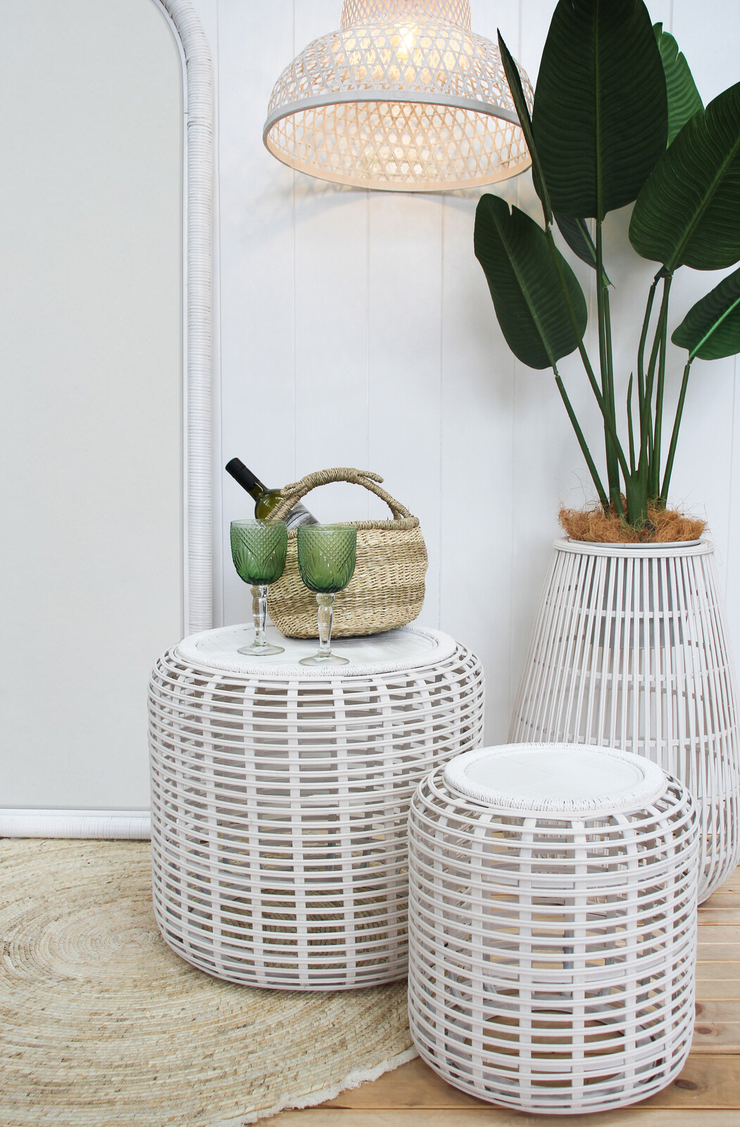 These Drum Tables in White Wash really are the most beautiful pieces of furniture. We love everything about them - the colour, the use of mixed materials, and the simplicity of their form. They have a very coastal look to them - which we realise can often be the case with bamboo homewares. But our team think this particular set has a bit more substance to it. They still absolutely radiate that relaxed and coastal home décor look and feel, but they’re a bit more unique in their design thanks to their lack of legs. The drum shape is an excellent feature, especially since we think it lends itself nicely to being used as either a stool or a table (as well as maybe even other purposes)! Their sizes are: L: 53x53x50cm S: 36x36x41cm. These ones have been white-washed for that more relaxed, coastal style - but it’s worth mentioning that some areas have been finished differently. The opacity might vary between pieces and batches. And because timber is not sealed, storing them in cool, dry places is ideal. (Also: PLANTS NOT INCLUDED).
