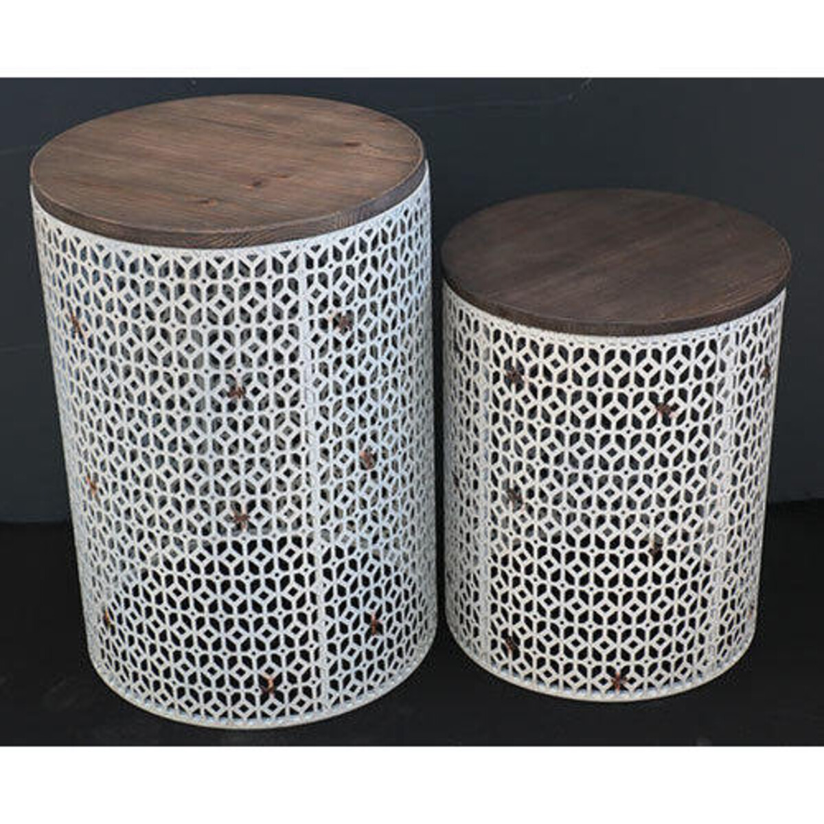 If it isn't the wood and metal combination that wins you over, surely it will be the intricate design of the grillwork that makes up its exterior. The drum tables have convenient height advantageous to making then perform as table extensions or side tables for couches, divan and all kinds of seating. The taller of the two is 64 cm and the shorter stands at 51 cm. The round table top in wood has an unpolished natural look much in keeping with shabby chic combined with vintage appeal that the tables hoist. Th white grill looks superb coordinating with the natural wood of the top. Makes a lovely impression in the garden or patio sit out. Those days when the seating too needs to be extended to accommodate more guest one is grateful for some table tops spaces too and these could come in real handy. The ultra - chic style makes a resounding impact with its steeped in tradition look alongside an attempt at being as congenially modern as possible.