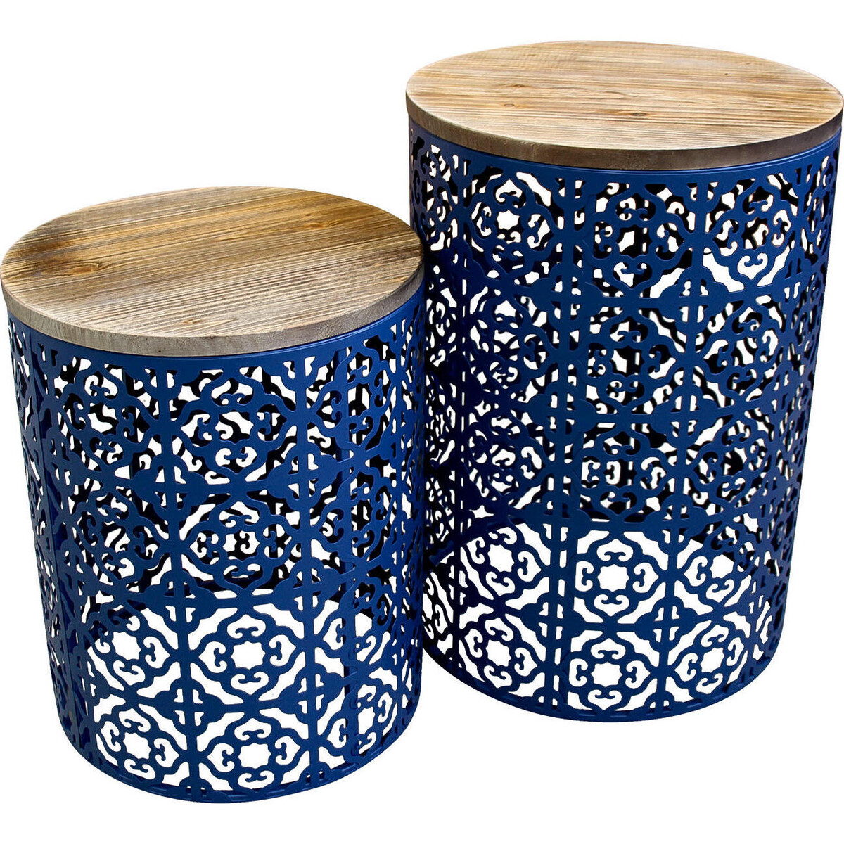 Things from the mid-eastern cultures have always been a great inspiration especially the designs and effect of Moroccan interiors, and here the set of tables not merely brings the detailed design to life but also gives it this brilliant liveliness of colour. The navy-blue coloured base combines gracefully with the natural wood coloured top. The round tables ae great as side tables or as that important accessory for all of your seating areas that might be indoors or outdoors. The sturdy round frae is made from metal and given this wash of paint and the upper round surface has been created from fine quality wood. The large table is sized at 45 cm dimeter and 65 cm height while the smaller one which can easily nest within the large one is 41 cm in height and 51 cm in height. Add that Moroccan votive or lamp, colourful cushions on the settee and you would be well on your way to creating some serios mid-eastern drama in your interiors with this useful inclusion.