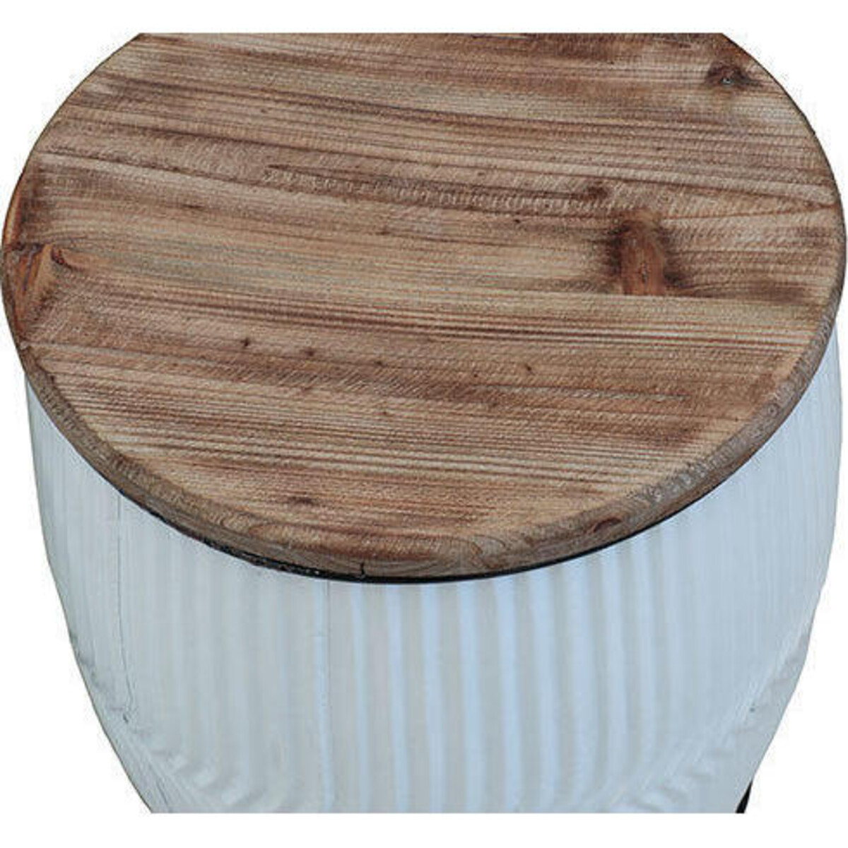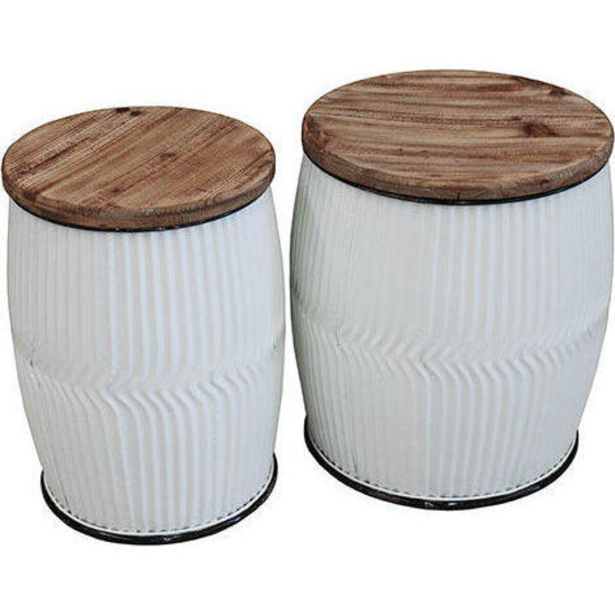 Add tables that give your spaces the advantage of real usability because if people have to sit, they need table top surfaces to place glasses, or books and you would surely like a lamp and some such things to generate the right kind of ambience. Such tables that are correctly designed are in themselves great for adding to the look of the space. These are shaped like drums and have round tops made of wood that adds that touch of whimsy - a shabby chic and modern design that will blend in well with the contemporary sort of home and yet has the making for indoor as well as outdoor look. The larger of the two has a height of 47 cm and a dimeter of the top at 42 cm while the smaller one is 46 cm in height with 35 cm diameter. The drum shaped come with corrugated sheet outer with a white finish while the top is left natural and woody - very refreshingly different from the over stylised tables one sees very often.